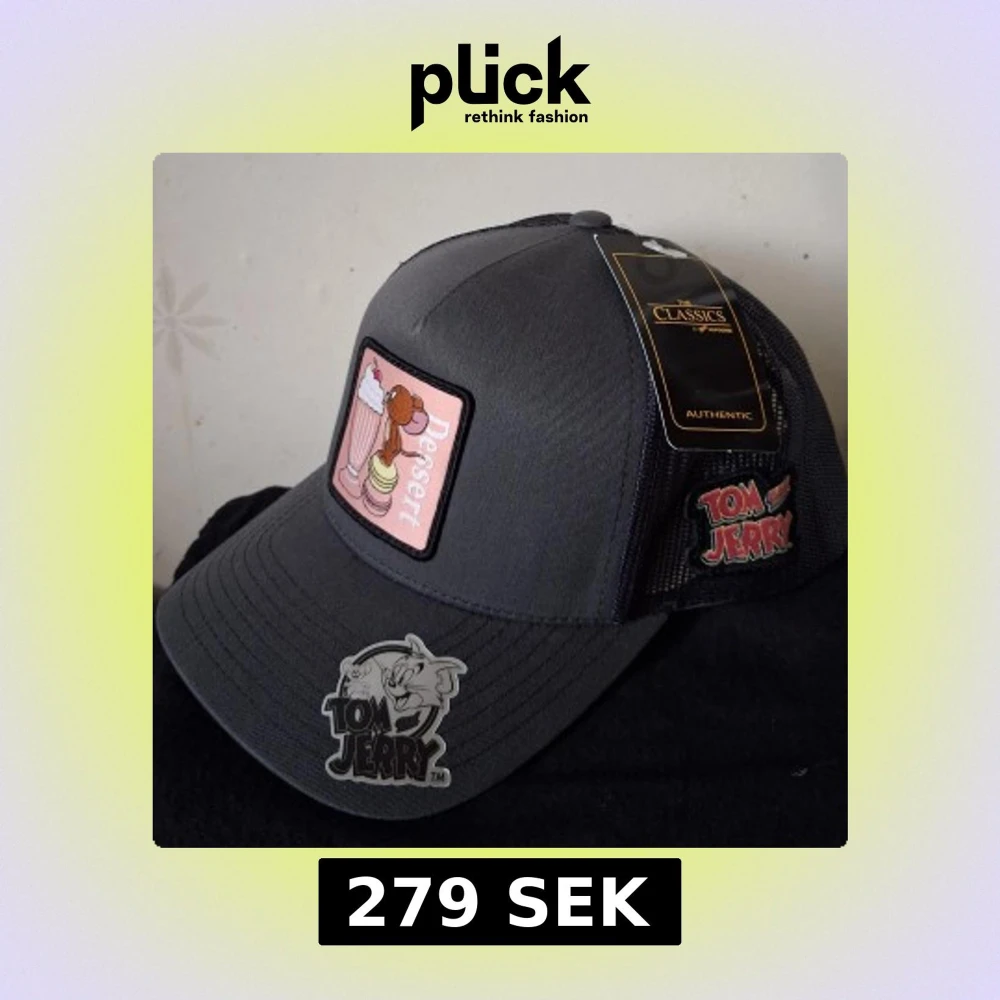 Snygg grå truckerkeps med Tom & Jerry-motiv och mesh på sidorna. Framtill finns en patch med Jerry och milkshake i rosa toner samt broderad Tom & Jerry-logga. Justerbar snapback och böjd skärm. Ny,oanvänd.