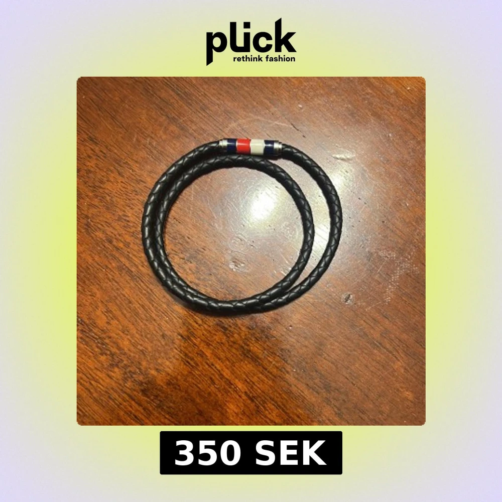 Stilrent svart armband i flätad design med ett magnetiskt lås i silverfärg. Låset har detaljer i blått, rött och vitt efter Tommy Hilfiger. Perfekt accessoar för dig som gillar en enkel men snygg look. 42 cm lång, men ska vikas som i första bilden. Hör av vid frågor!🙌🏽Alltid öppen till prisförslag!