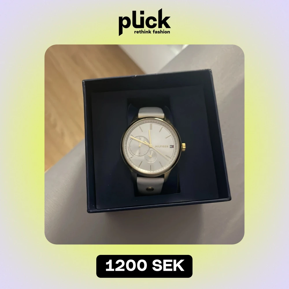 Säljer en stilren vit klocka från Tommy Hilfiger. Den har en elegant vit urtavla med guldiga detaljer och en vit skinnrem. Perfekt för både vardag och fest! Klockan kommer i originalförpackning. Helt ny.