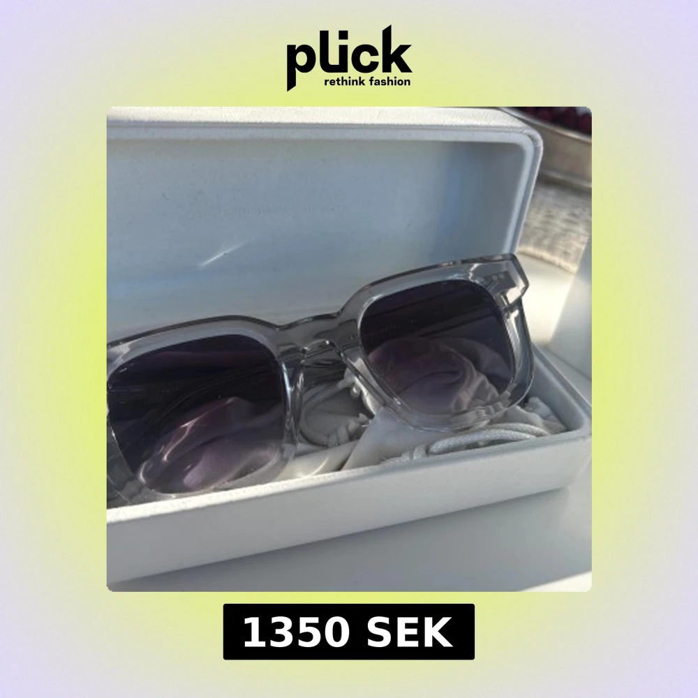 Säljer ett par snygga solglasögon från CHIMI med transparent båge och mörka glas. Modell 04 Grey. Kommer med originalfodral, putsduk och påse. Helt nya och kvitto finns kvar!
