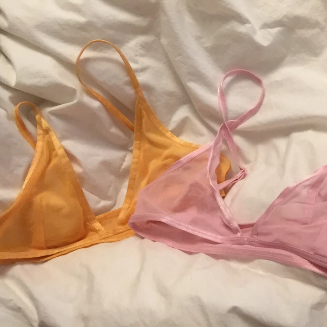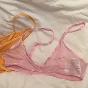 H&M Mjuka, bygellösa bh-toppar i mesh med kantband i mjuk trikå. Bh:arna har ofodrade kupor som ger ett lätt stöd och naturlig form åt bysten. Reglerbara axelband. Saknar knäppning. Storlek s Färg: rosa och orange. För små byst/bröst. Endast provade.