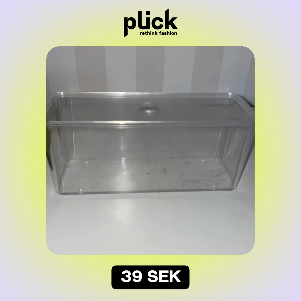 Säljer en rektangulär transparent plastlåda med tillhörande lock. Perfekt för förvaring av diverse småsaker. Lådan är enkel att stapla och har en slät yta. Mått 22 cm* 8 cm, höjd 8 cm. Har 2 st. samma lådor + en lite större.
