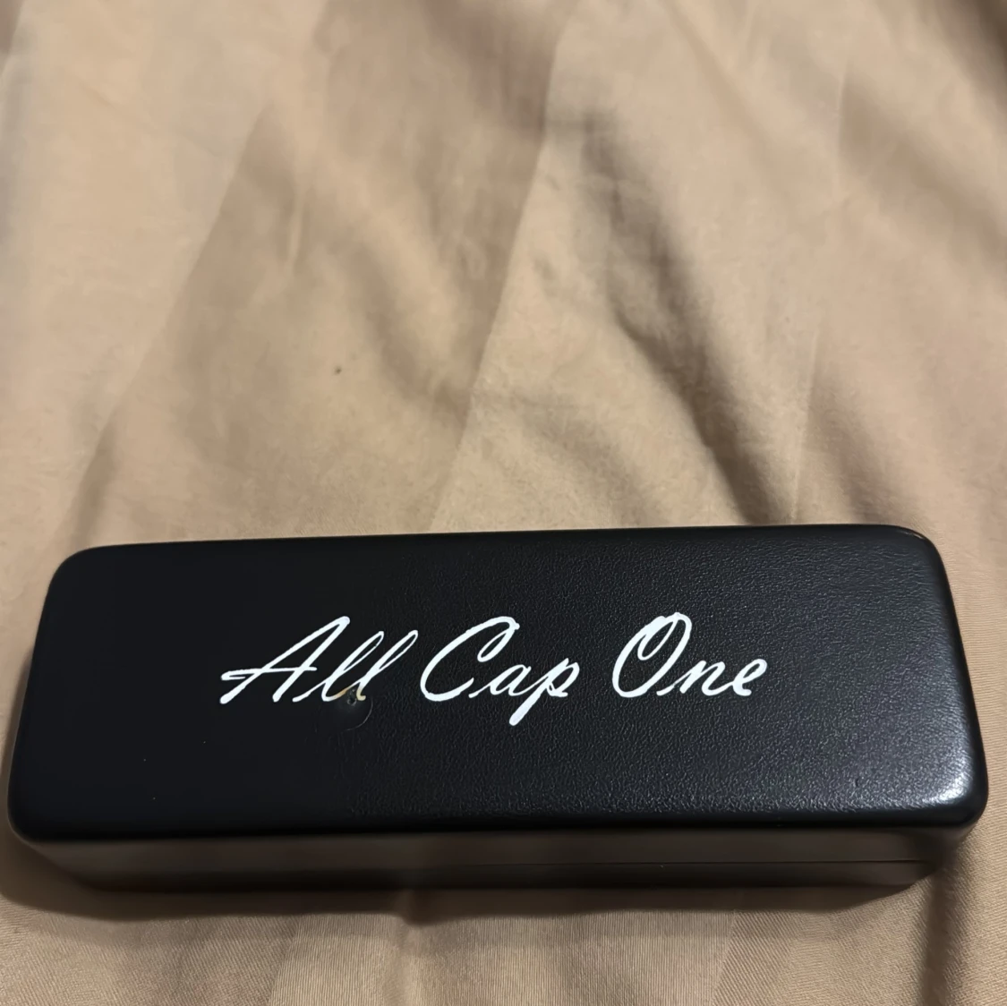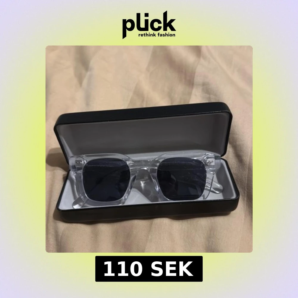 Snygga solglasögon med transparent båge och mörka linser från All Cap One. Perfekta för en stilren look. Kommer i ett elegant svart fodral. Det är även lite repor men det är inget man merker.