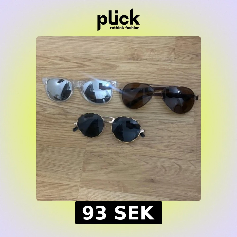 Säljer tre par solglasögon: ett par med transparent båge och spegelglas, ett par klassiska pilotbågar med bruna linser och ett par runda glasögon med guldiga detaljer och svarta linser. Perfekta accessoarer för att lyfta din stil.