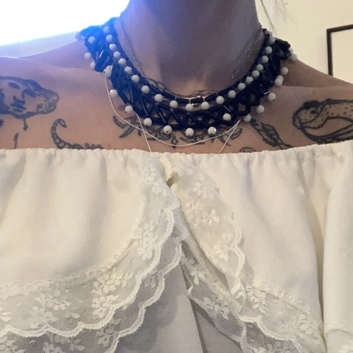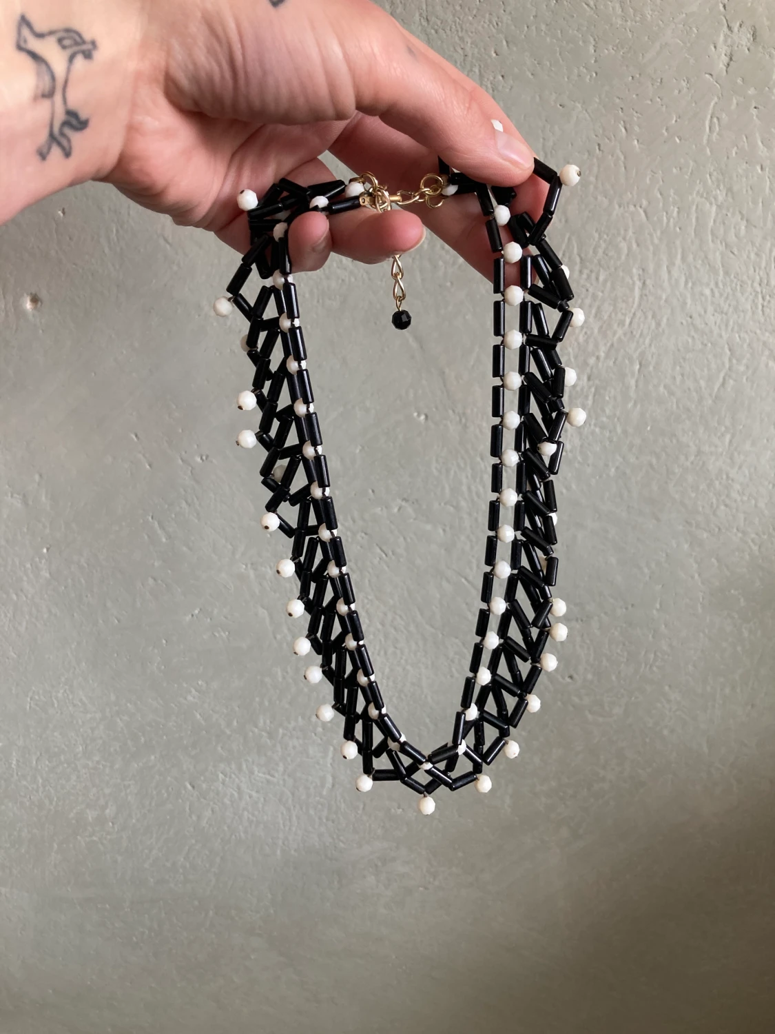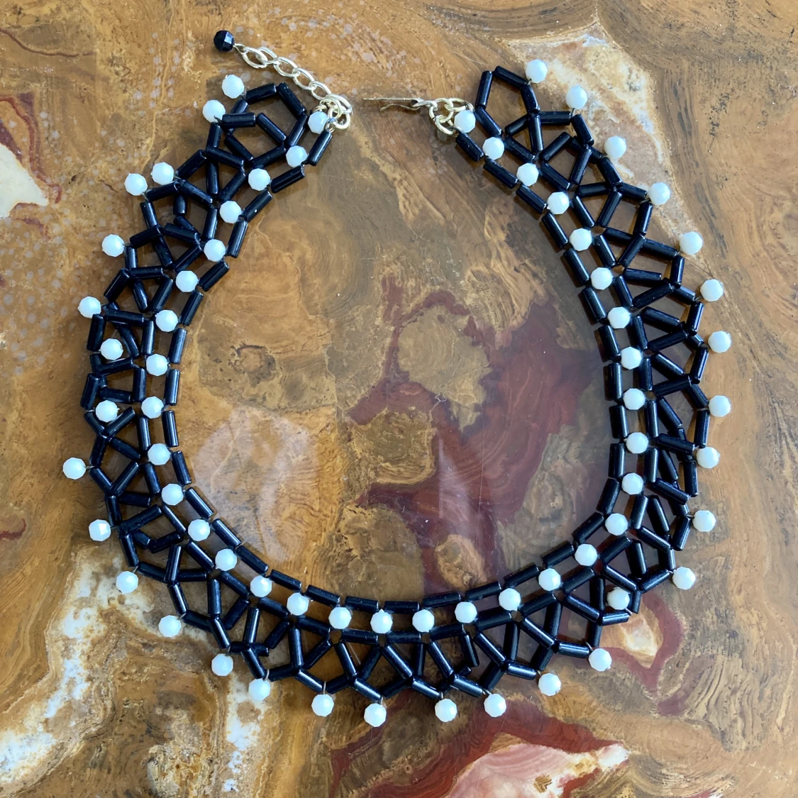Unikt halsband i svart och vitt. Riktigt hantverk! I superbra skick. Stängs med en pin som man nyper åt.
