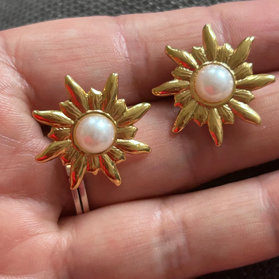 Unika örhängen i form av en sol med guldig finish och en rund vit pärla i mitten. De har en cool och iögonfallande design som verkligen sticker ut. Perfekta för dig som vill ha något annorlunda och trendigt i smyckeskrinet.
