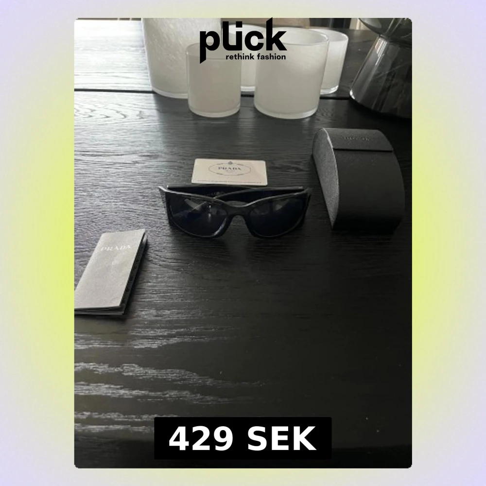 Snygga svarta solglasögon från Prada med breda skalmar och mörka linser. Glasögonen har en stilren, rektangulär form och kommer med originalfodral, certifikat och manual. Tillverkade i Italien och har Prada-logga på skalmen.