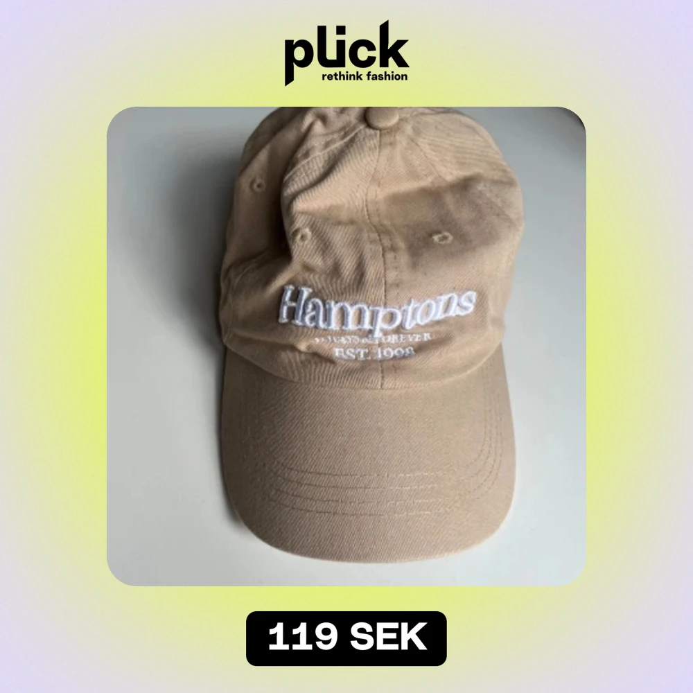 Beige keps med vit text "Hamptons" och "EST 1908". Aldrig används!