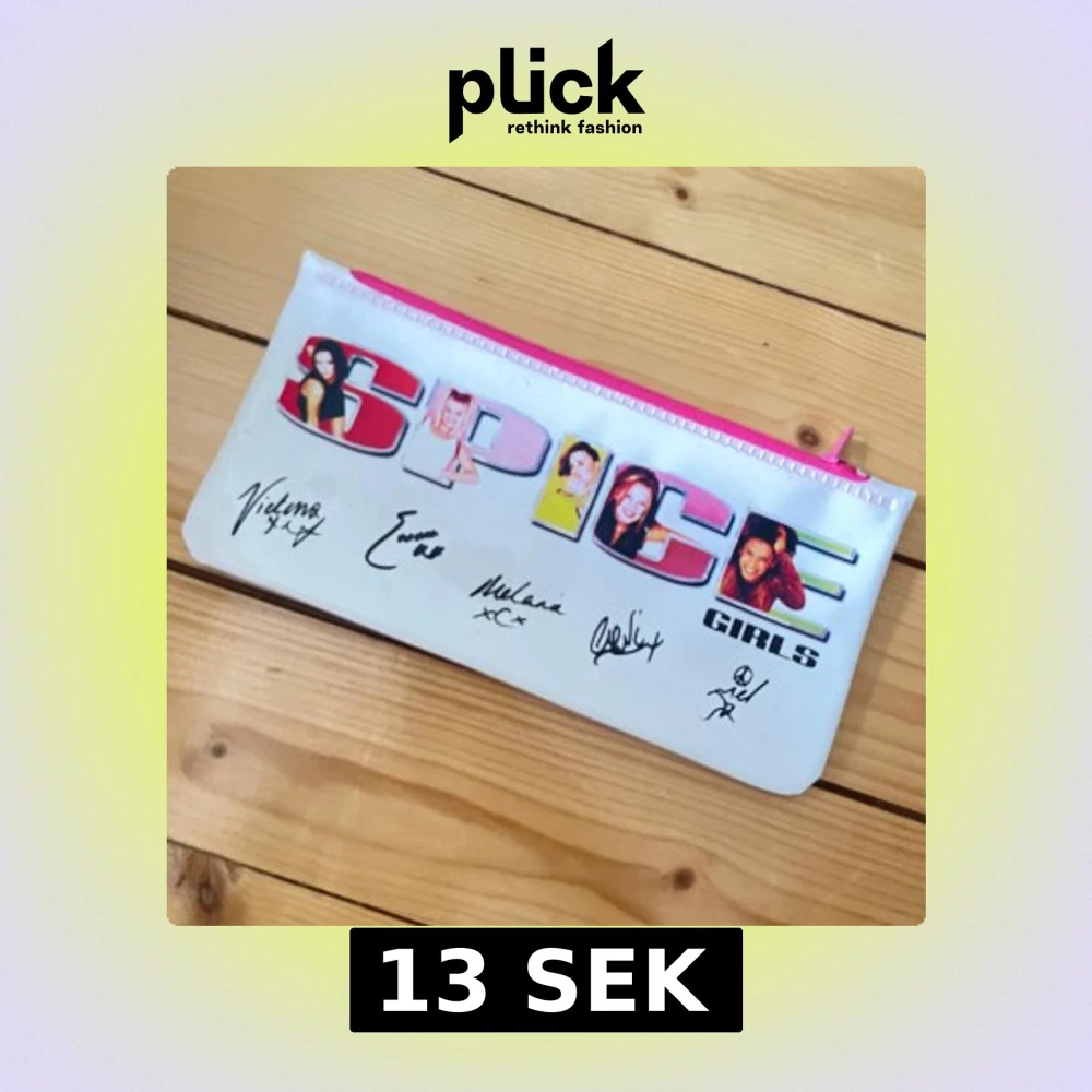Pennfodral i vit syntet med färgglad Spice Girls-tryck och tryckta autografer på framsidan. Väskan har en rosa dragkedja och är platt i formen, perfekt för småsaker eller som cool accessoar. Ikonisk design för dig som älskar 90-tals popkultur.