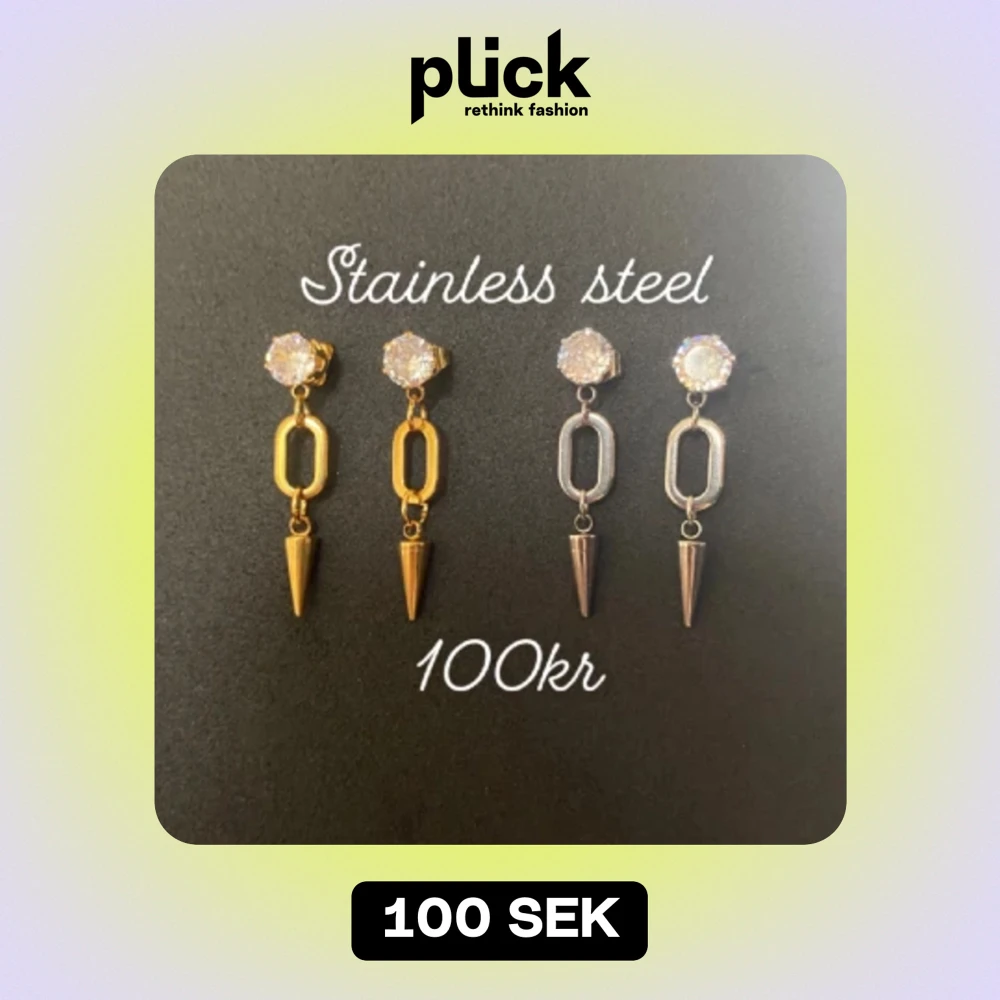 Örhängen med halsband  - Stilrena örhängen och halsband inspirerade av Maria Nilsdotter. Material-rostfritt stål. Örhängen längd-3,7cm, halsband längd-40cm. ☝️Vid köp ingår två extra berlocker som kan bytas ut, då själva hänget är ömtåligt och känsligt för stötar.