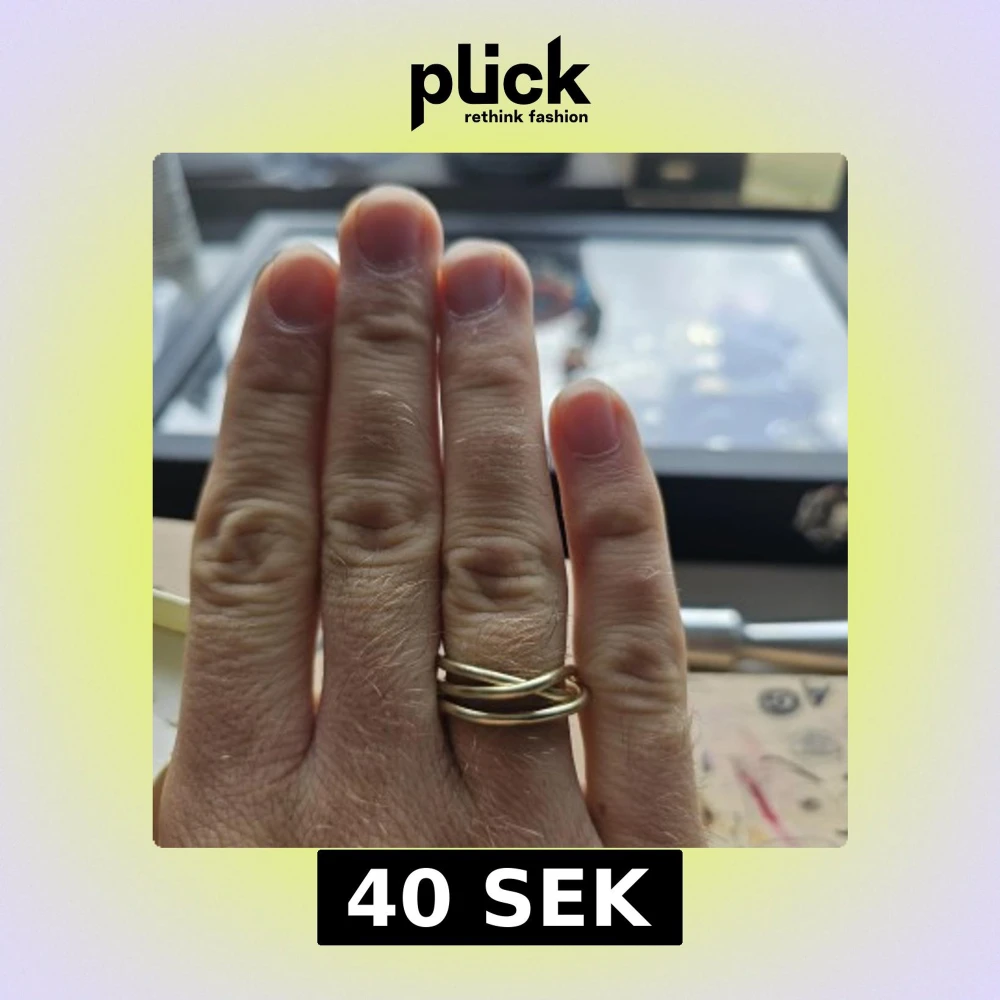 Handgjord ring i guldton med flera tunna slingor som korsar varandra och ger en unik, modern look. Den har en minimalistisk design och passar perfekt om du gillar statement-smycken med lite edge. Är i aluminium och är st 17.7 mm