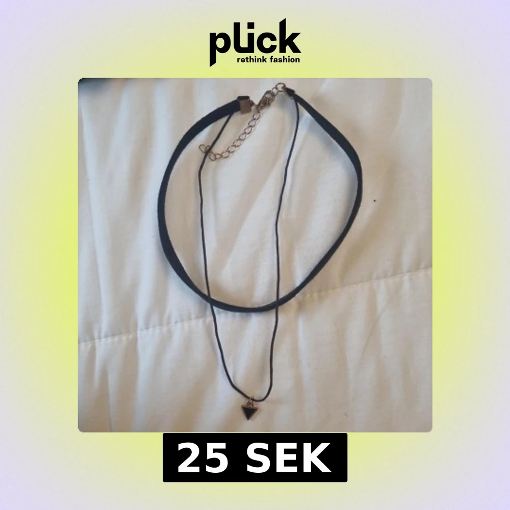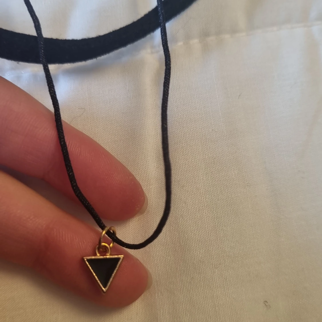 Snyggt svart chokerhalsband med ett litet triangulärt hänge i guld och svart. Perfekt för att ge en stilren touch till din outfit. Justerbar kedja för bästa passform. Kontakta vid mått, frågor, intresse eller liknande. ❤️