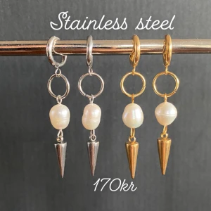 Guldpläterat halsband med droppformade pärlor - Elegant halsband i guldpläterat rostfritt stål – finns även i silverfärgad variant. Matchande örhängen finns i en separat annons.  Smycket är 9 mm brett och har en justerbar längd mellan 38–43 cm, vilket gör att det passar perfekt oavsett stil och tillfälle.. De nickelfria och handgjorda