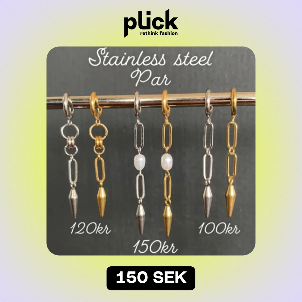 Örhängen med halsband  - Stilrena örhängen och halsband inspirerade av Maria Nilsdotter. Material-rostfritt stål. Örhängen längd-3,7cm, halsband längd-40cm. ☝️Vid köp ingår två extra berlocker som kan bytas ut, då själva hänget är ömtåligt och känsligt för stötar.