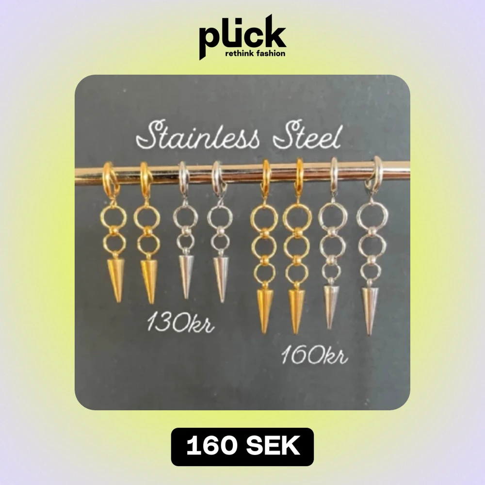 Guldiga örhängen med spetsig detalj - Säljer ett par coola guldiga örhängen med rund ring, klar sten och hängande spetsig detalj.
