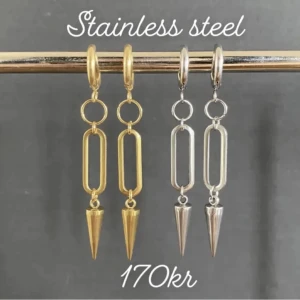 Örhängen med halsband  - Stilrena örhängen och halsband inspirerade av Maria Nilsdotter. Material-rostfritt stål. Örhängen längd-3,7cm, halsband längd-40cm. ☝️Vid köp ingår två extra berlocker som kan bytas ut, då själva hänget är ömtåligt och känsligt för stötar.