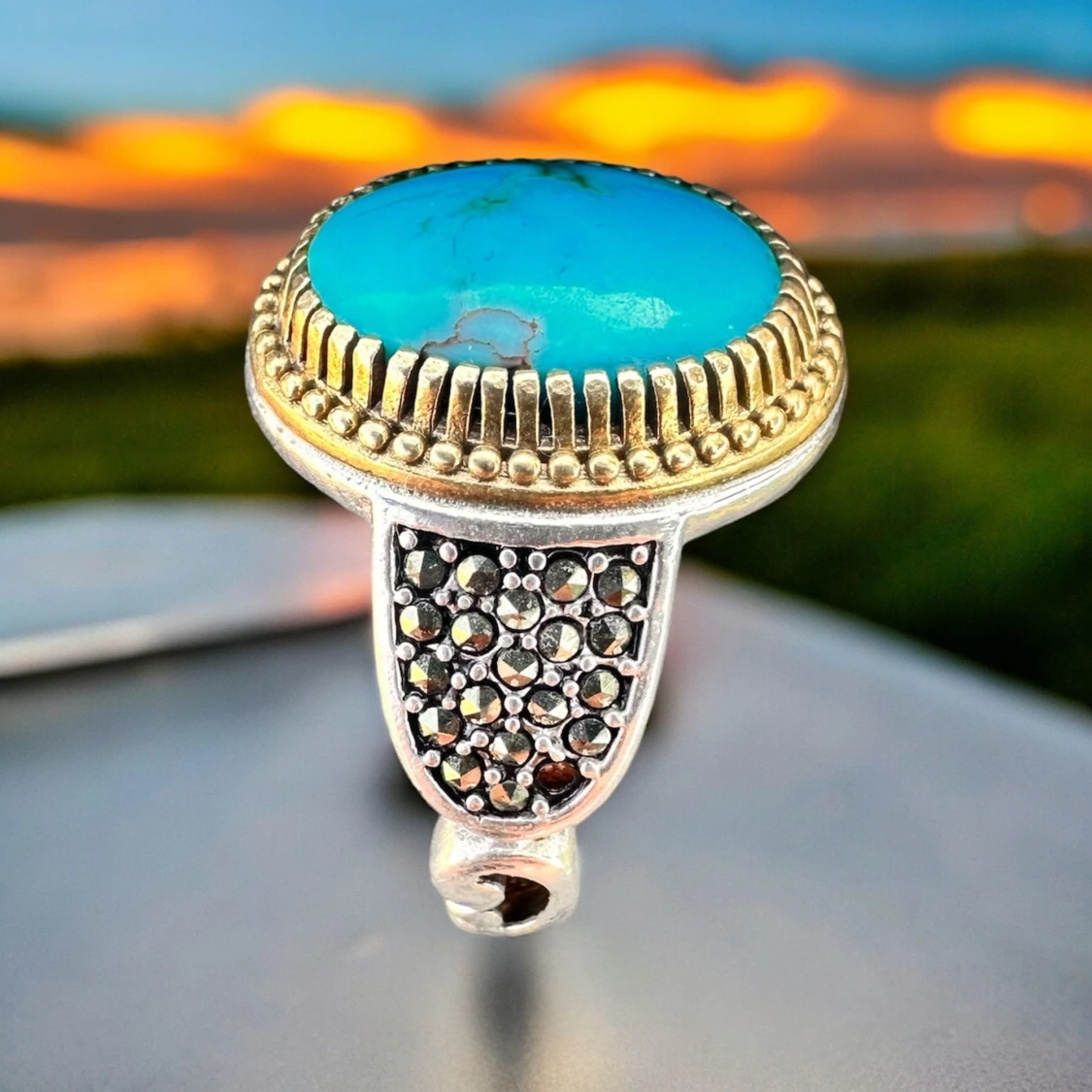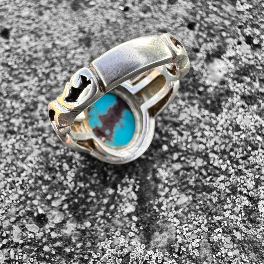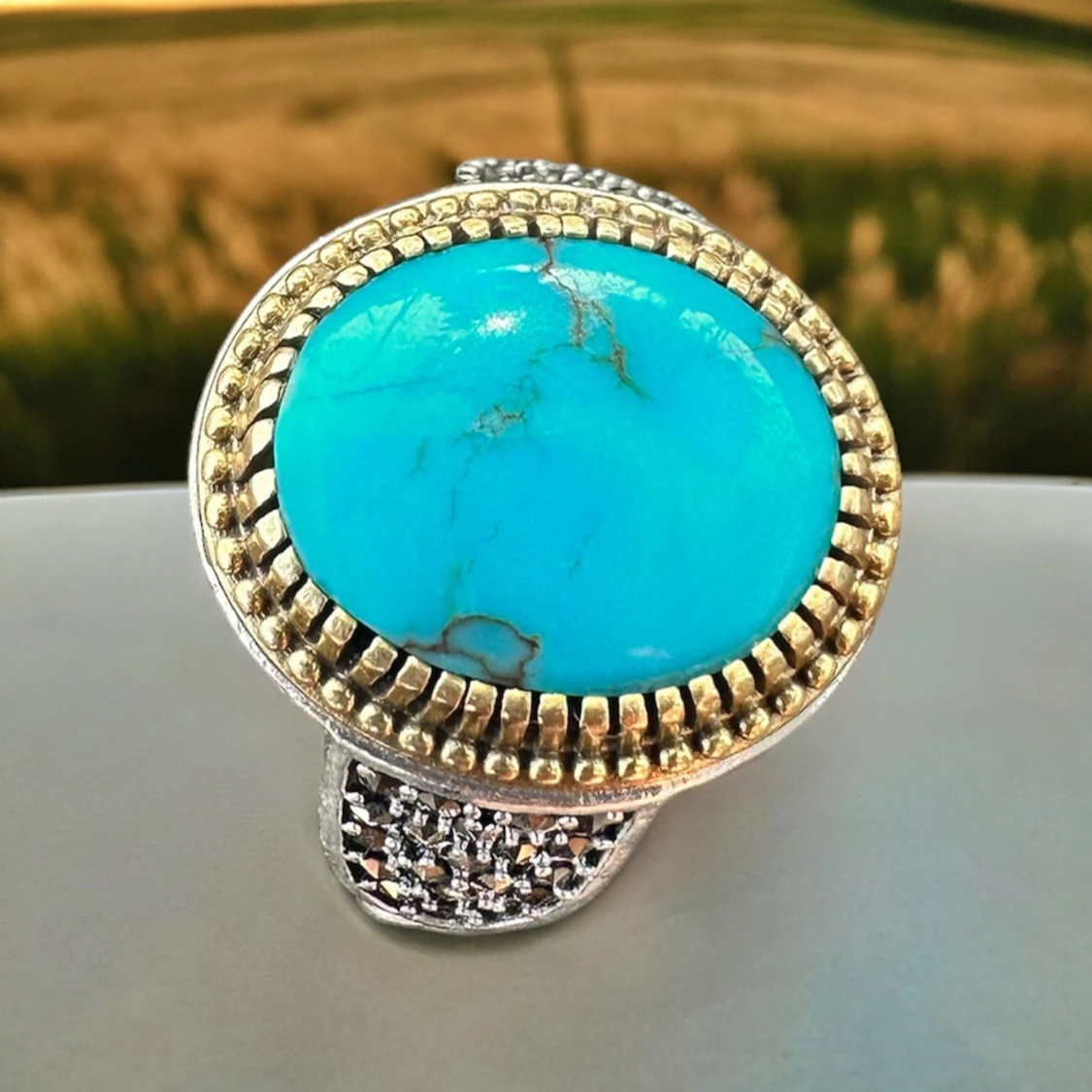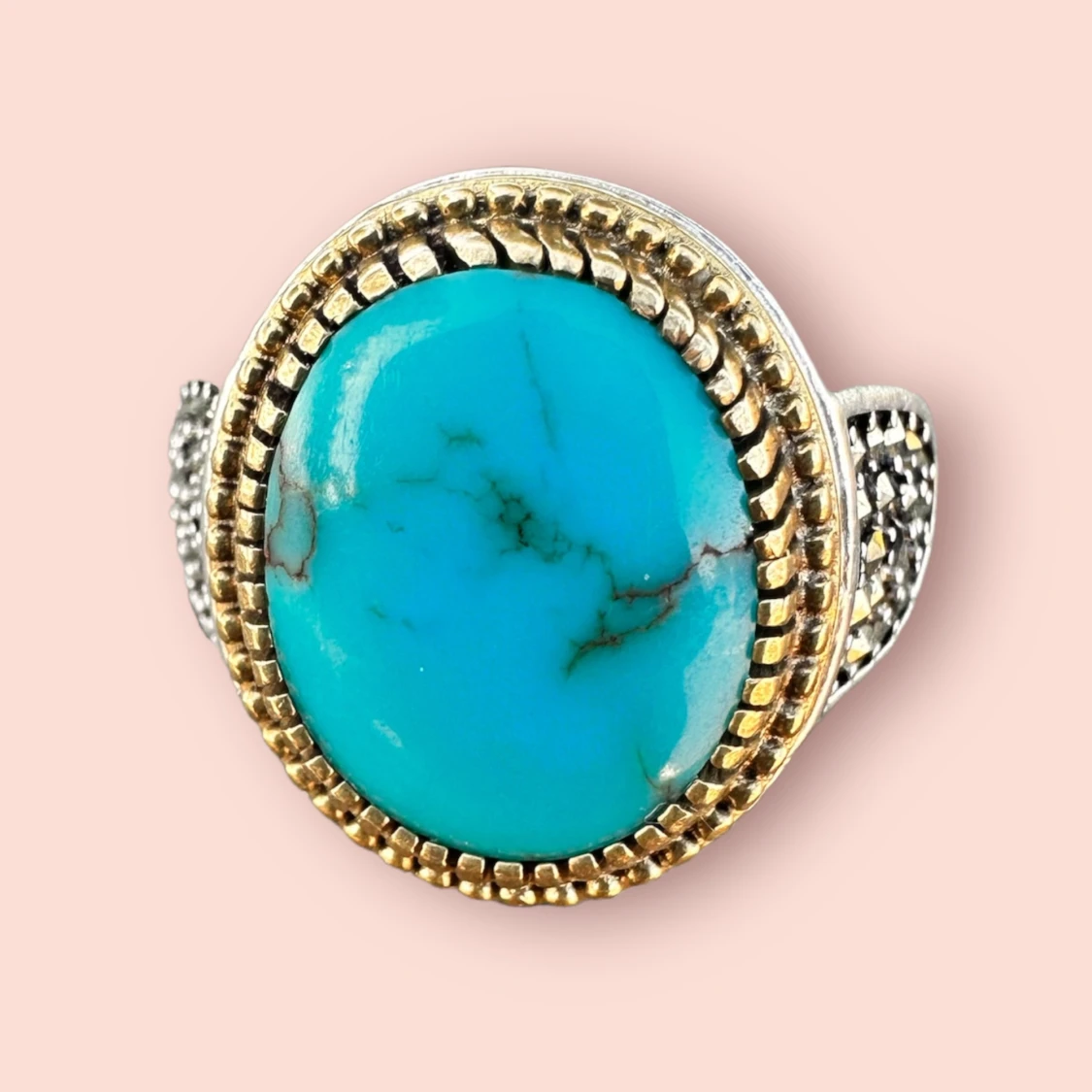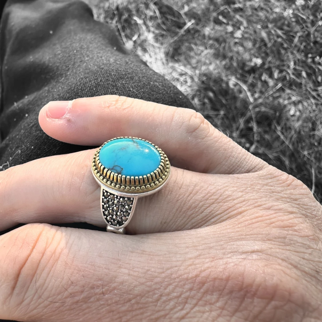 En vacker naturell turkos ring framkallar känslan av naturens skönhet och mystik. Ringen är smyckad med en äkta turkos sten, vars färg skiftar från djupblått till intensivt grönt, med naturliga ådror och inslag som ger varje sten en unik karaktär.