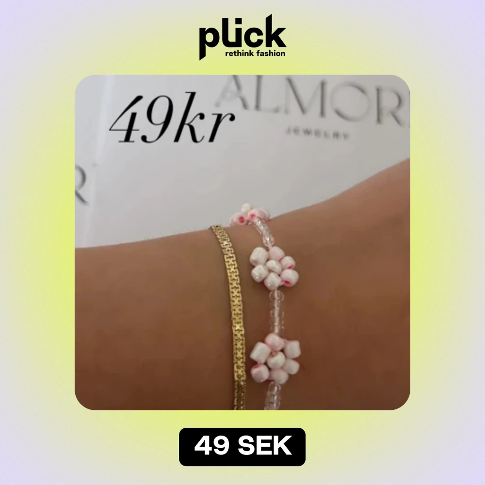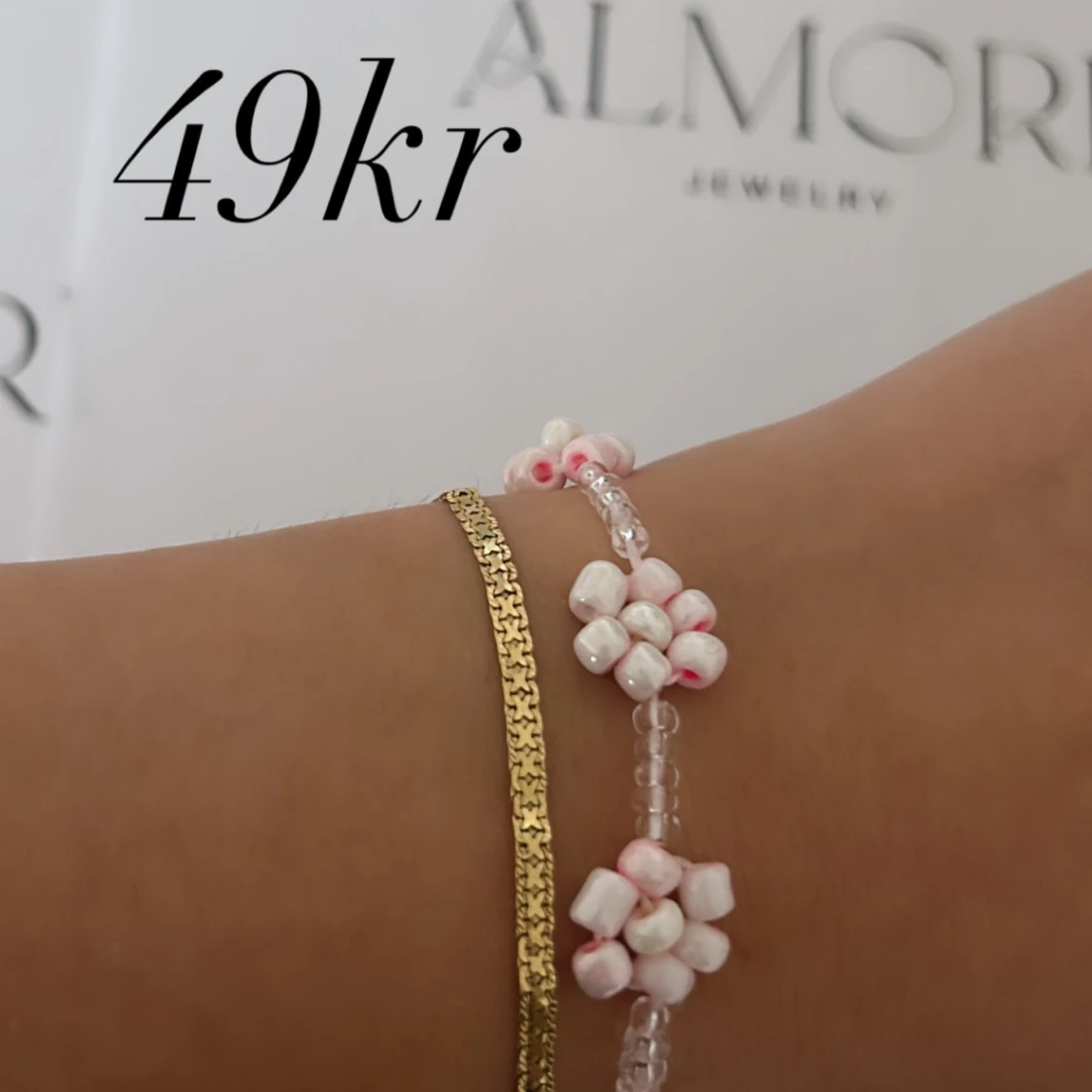 Ett vackert armband med små vita och rosa pärlor formade som blommor. Perfekt för att ge en elegant touch till din outfit.