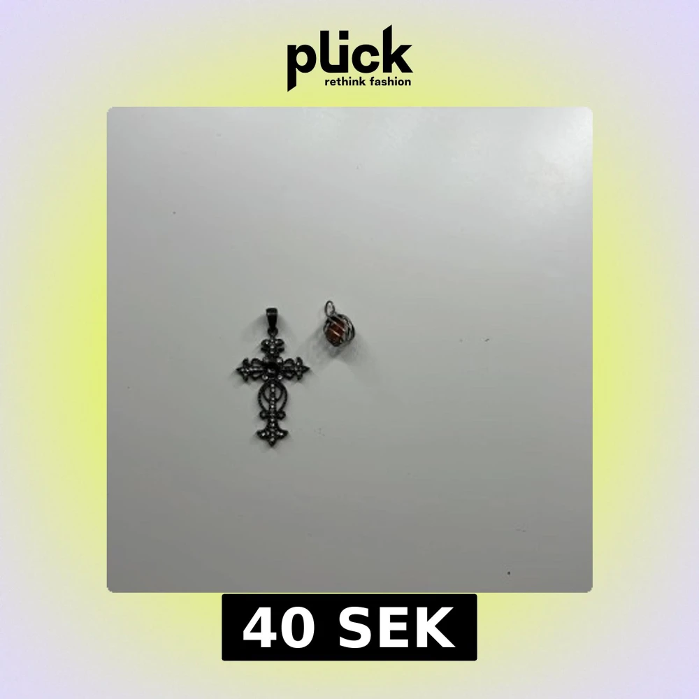 Säljer två snygga hängen: ett korsformat hänge i mörk silverfärg med glittrande stenar och detaljerad design, samt ett runt hänge med en orange sten inuti en spiral av silverfärgad metall. Perfekta att mixa och matcha till kedja.