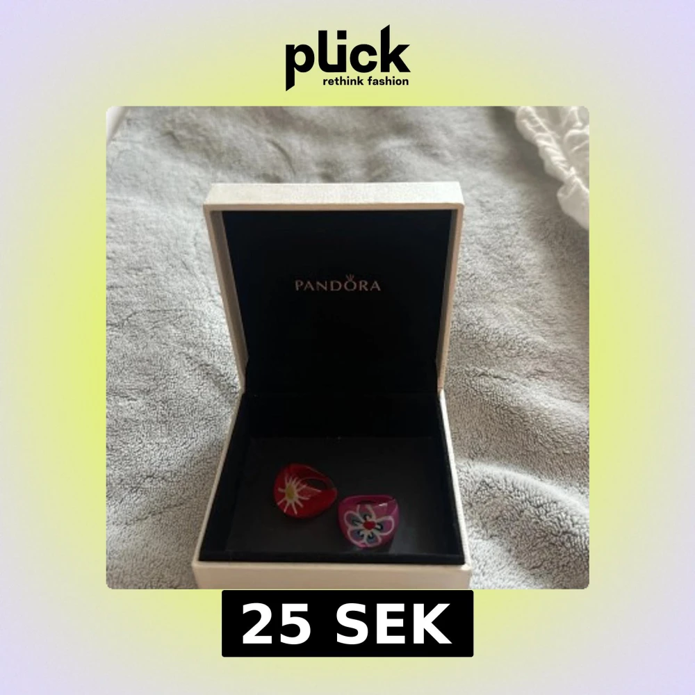 Säljer två unika ringar från Pandora i röd och lila färg. Den röda ringen har ett solmönster i vitt och gult, medan den lila ringen har ett blommönster i blått, vitt och rosa. Perfekta för att ge din stil en färgklick!