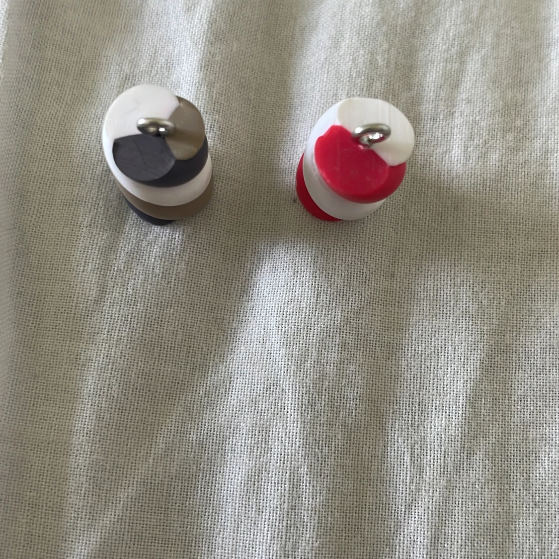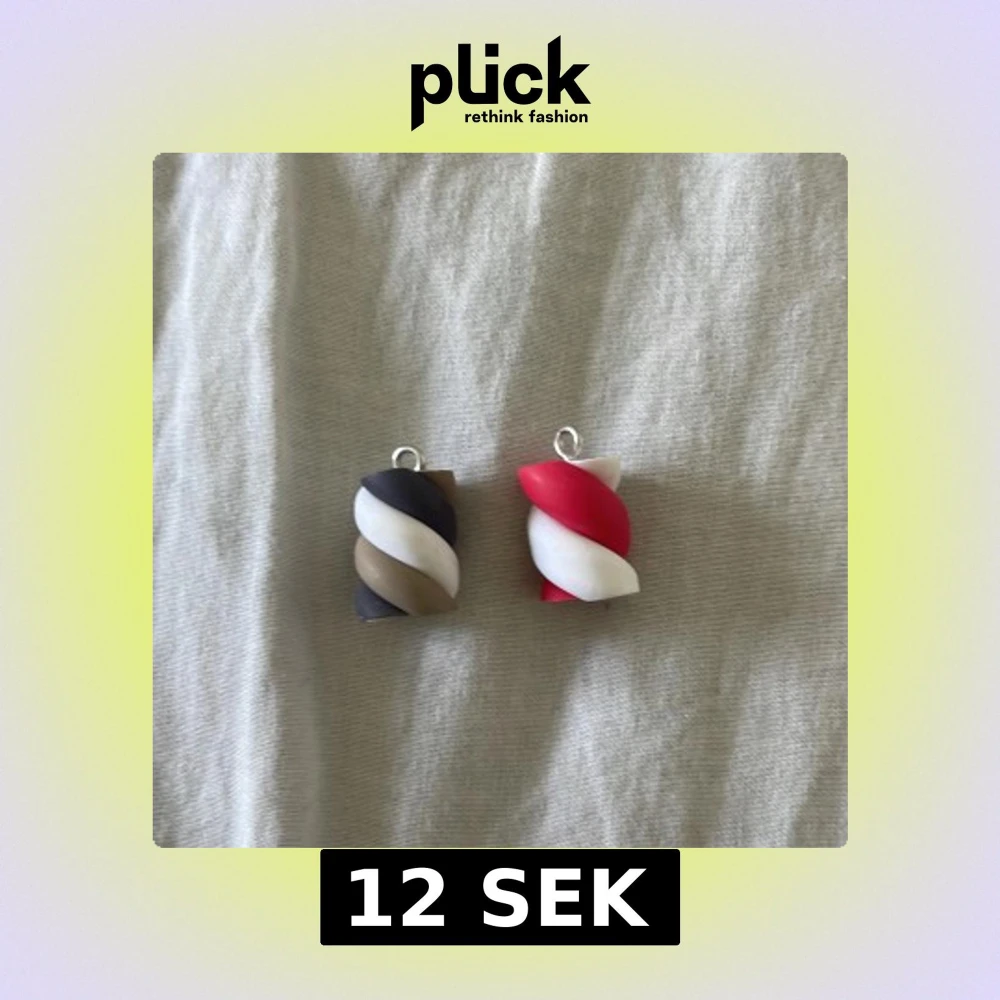 Två handgjorda berlocker i swirl-design, en i svart, vitt och brunt och en i rött och vitt. Perfekta som hängen till halsband eller armband. De har en cool, vriden form och är tillverkade i polymerlera med metallögla för enkel fastsättning.