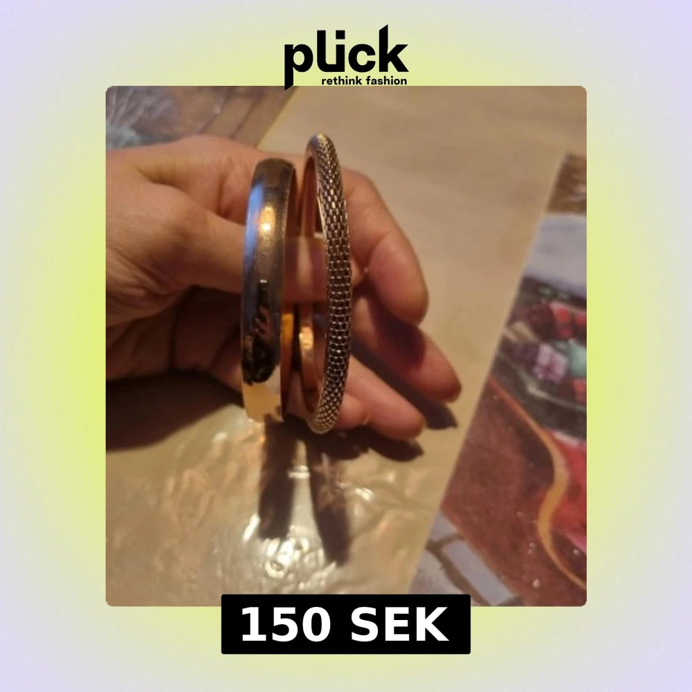 Säljer två snygga armband i guldig metall. Ett är slätt och blankt medan det andra har ett coolt rutmönster som ger extra edge. Båda är runda och passar perfekt för att ge din stil lite extra bling. Perfekt att mixa och matcha med andra smycken.