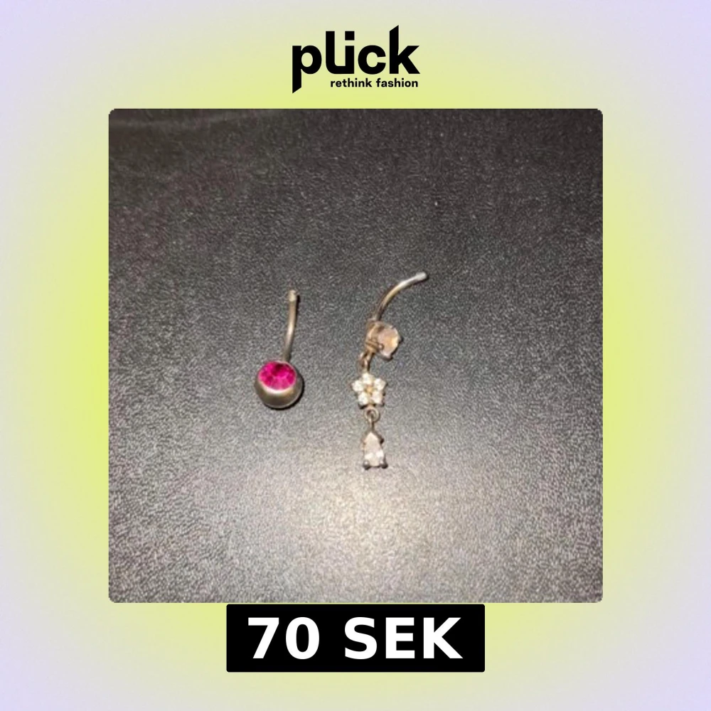 Säljer två jätte gulliga navelpiercingar utan kula. Den ena har en rosa sten i silverfärgad infattning, medan den andra har en hängande design med små blommor och klara stenar🩷