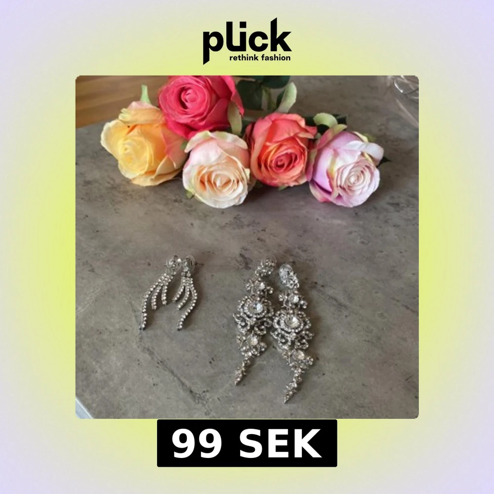 Säljer två par örhängen i silverfärg med gnistrande stenar. Ena paret har en vågig, modern design med små kristaller, det andra är längre och mer detaljerat med barockinspirerat mönster och massor av glittrande stenar. Perfekta för att sticka ut och ge extra bling till din look.
