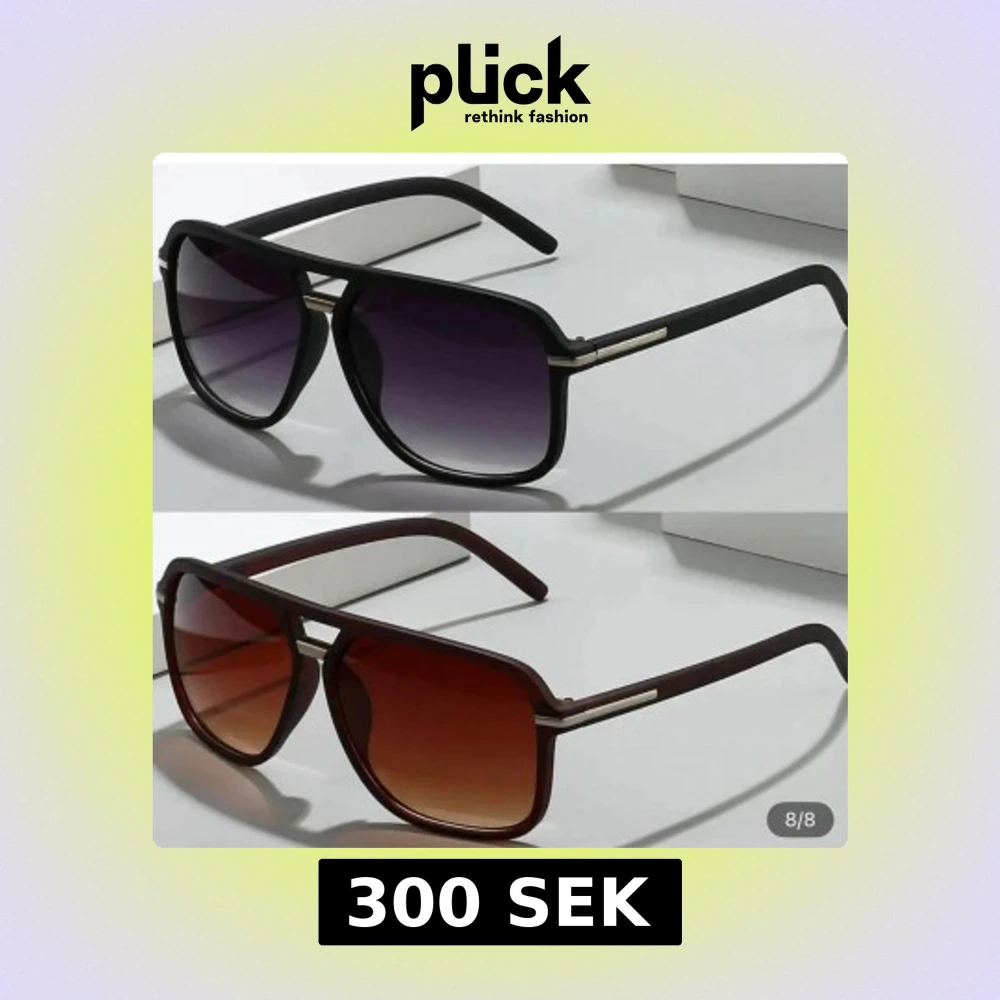 Två par solglasögon med klassisk retrodesign. Ena paret har svart båge och mörka, tonade linser, det andra har brun båge med bruna, tonade linser. Båda har fyrkantig form och metalliga detaljer vid skalmarna. Perfekta för en cool look i solen. 300kr för båda
