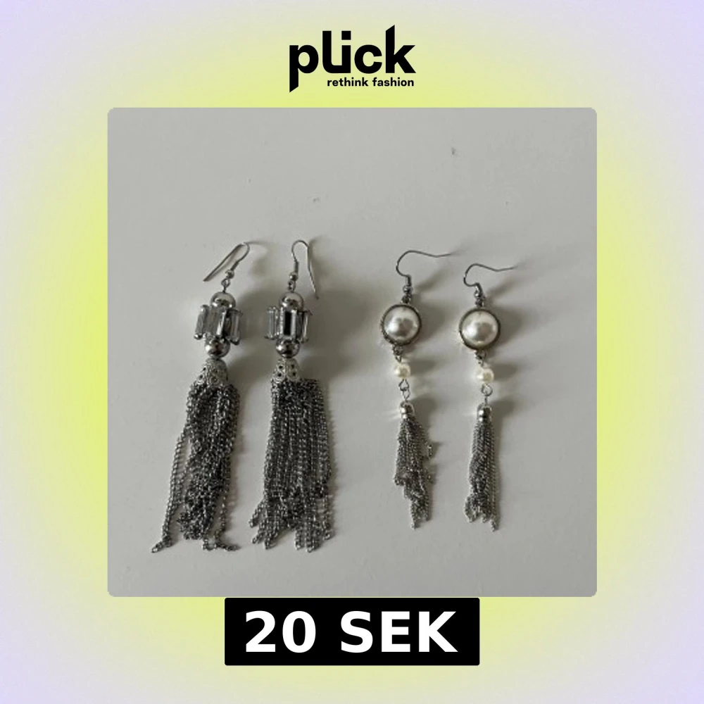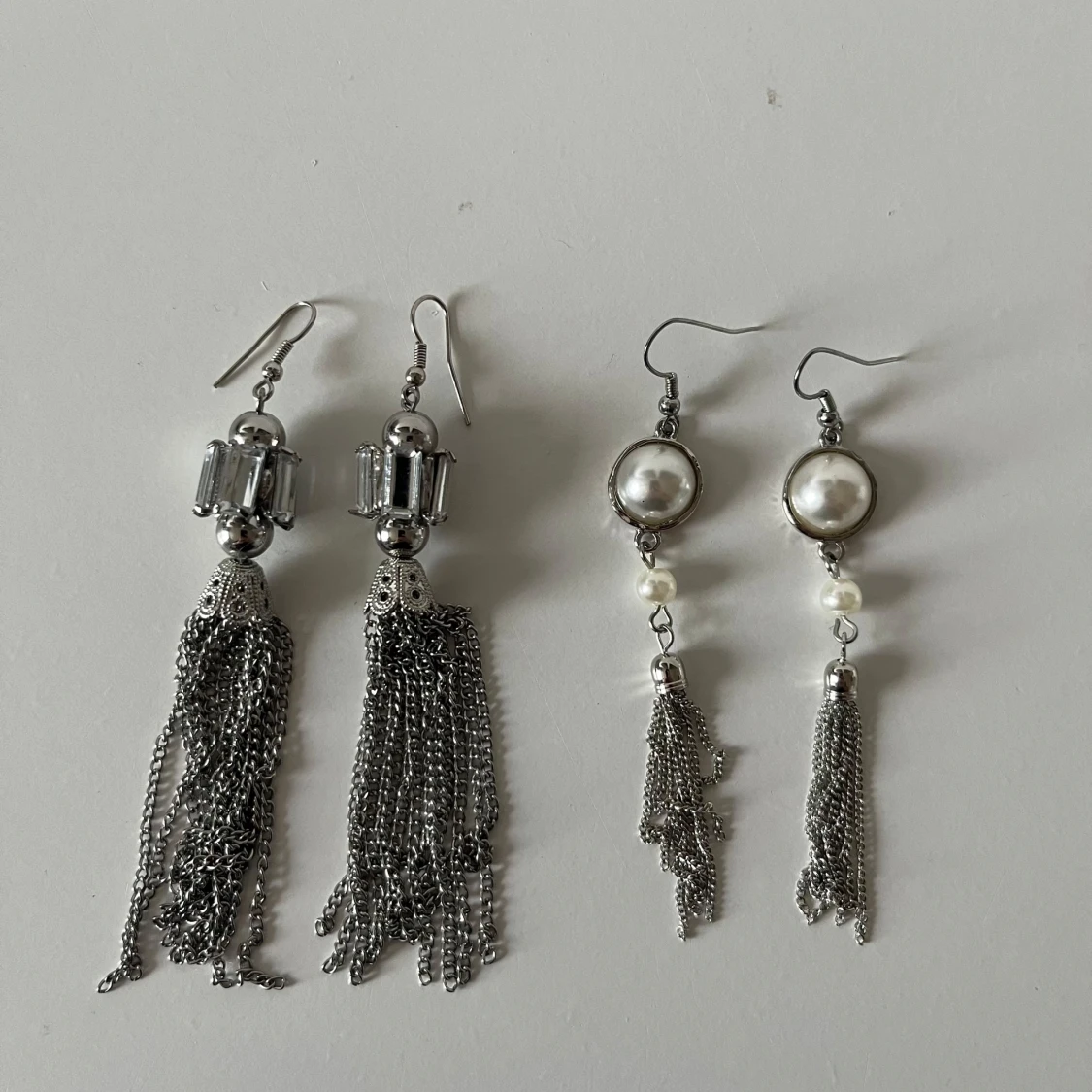Säljer två par coola örhängen i silverfärg. Ena paret har glittriga stenar och långa kedjor, det andra har stora pärlor och kedjor som hänger ner.