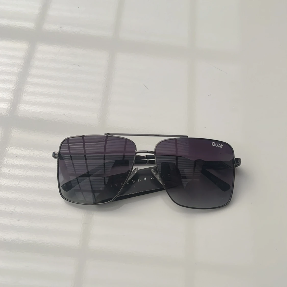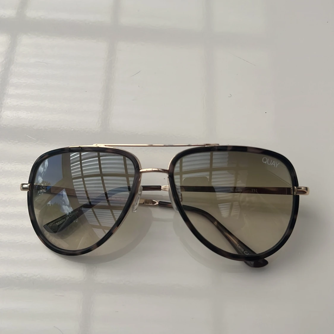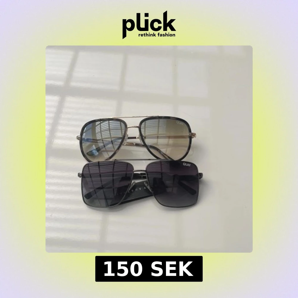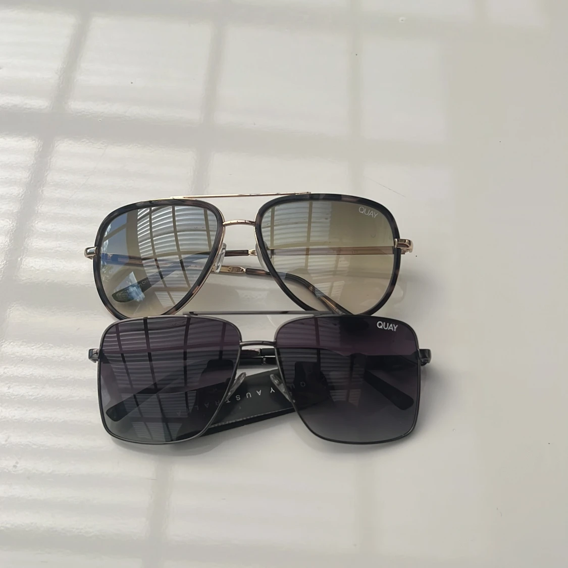 Säljer två par snygga solglasögon från Quay. Ena paret har klassisk aviatorform med guldiga detaljer och tonade grå linser paret kallas ALL IN, det andra paret har fyrkantig form med svarta bågar och mörka linser. Perfekta accessoarer för en cool look paret heter POLAR