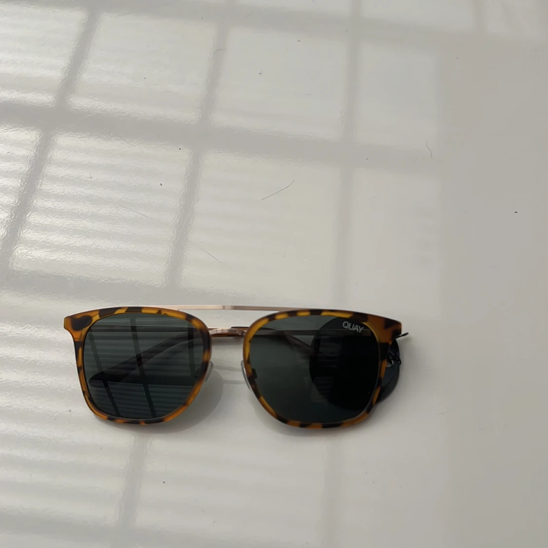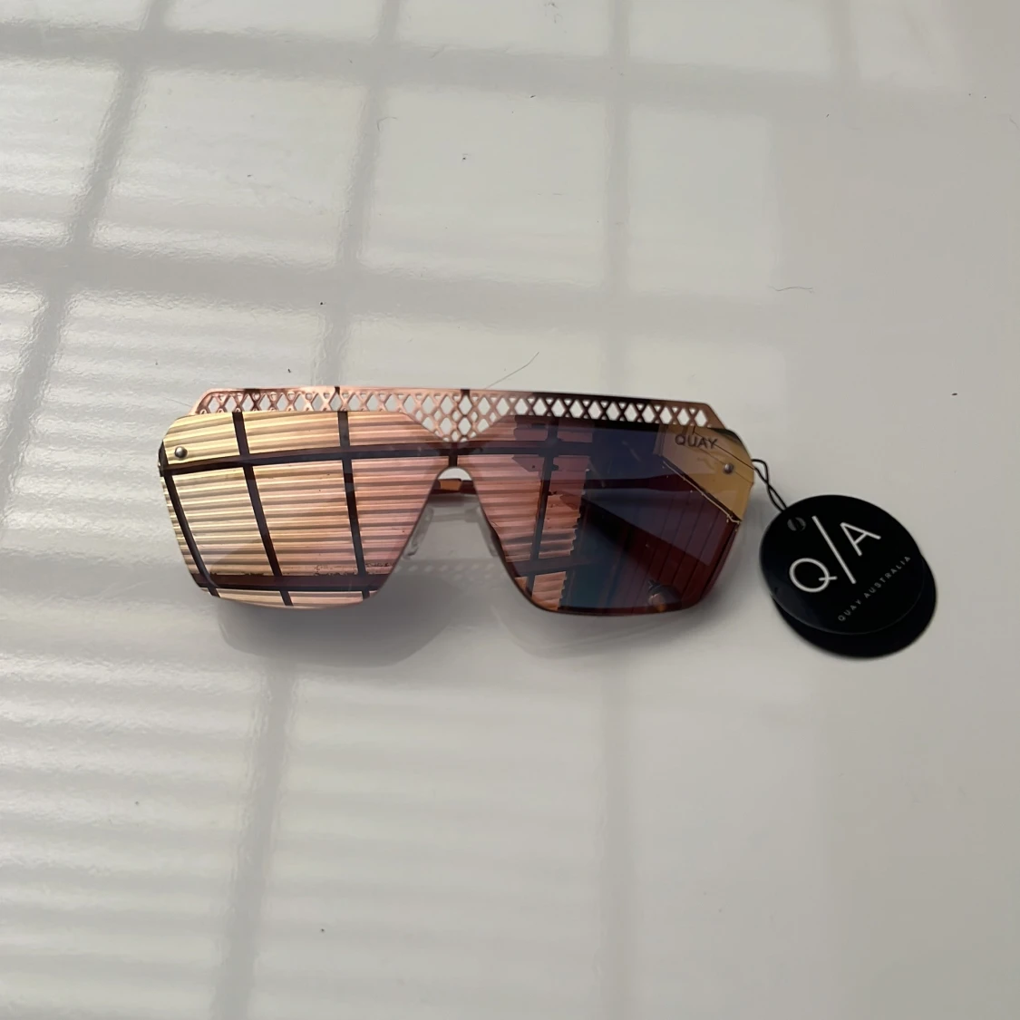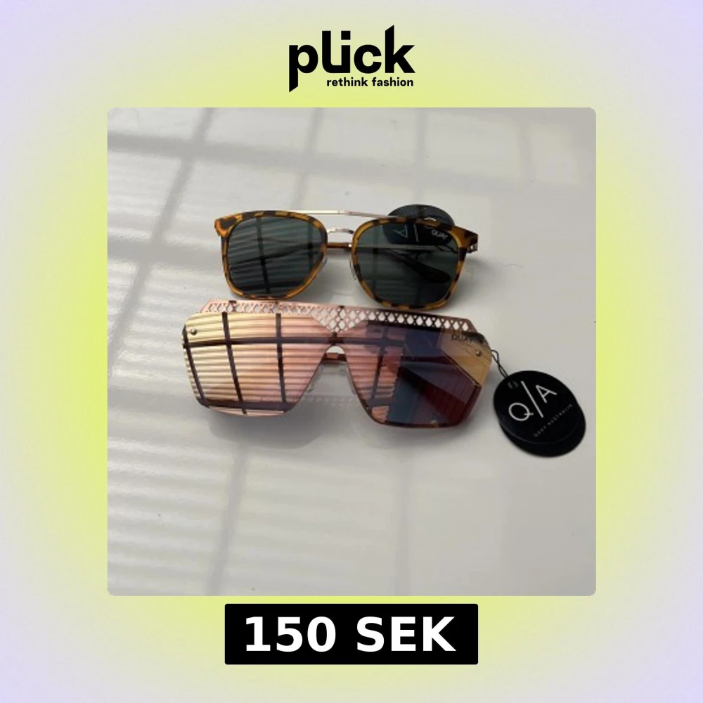 Säljer två par snygga solglasögon från Quay. Ett par har brunmelerad båge med fyrkantig form och mörka glas. Det andra paret är stora kallas BYRON ,sköldformade med guldiga och rosa spegelglas samt coolt rutmönster och metallnät upptill. Perfekta accessoarer för att sticka ut kallas HALL OF FAME