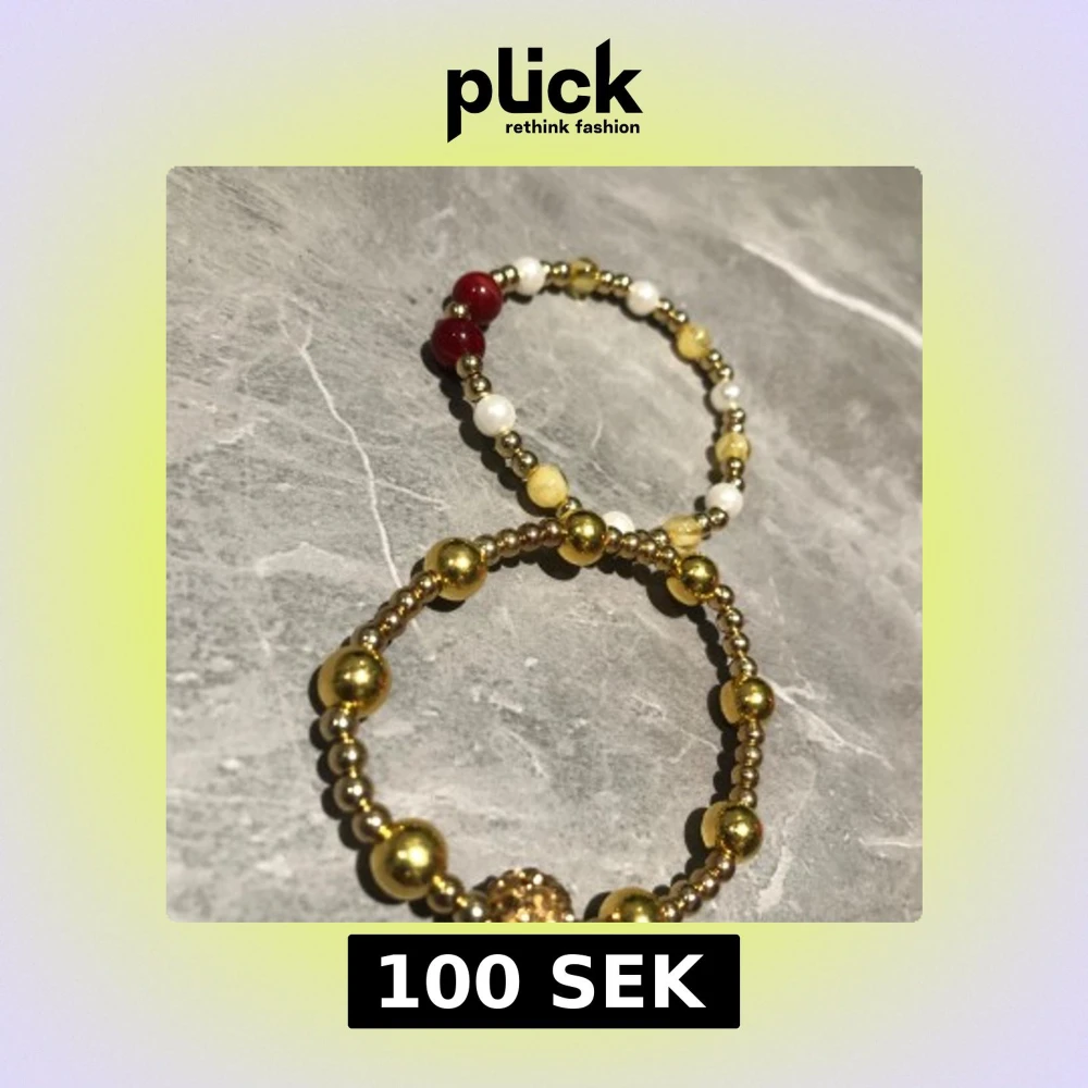 Säljer två eleganta pärlarmband. Ett armband har guld- och silverpärlor med en dekorativ guldfärgad pärla. Det andra armbandet har en mix av vita, röda och guldiga pärlor. Perfekta för att ge en touch av färg och stil. 100kr för båda 50kr för ett