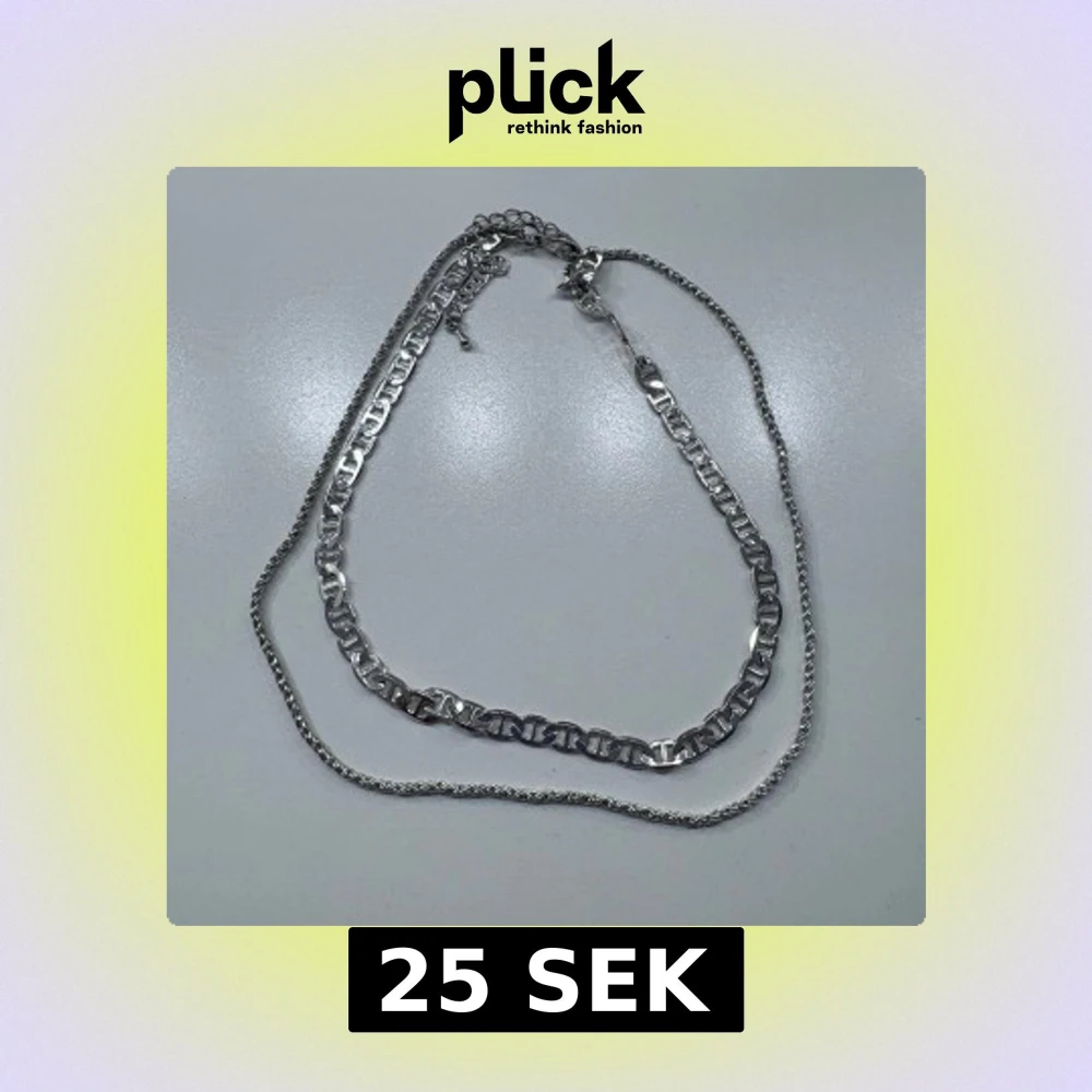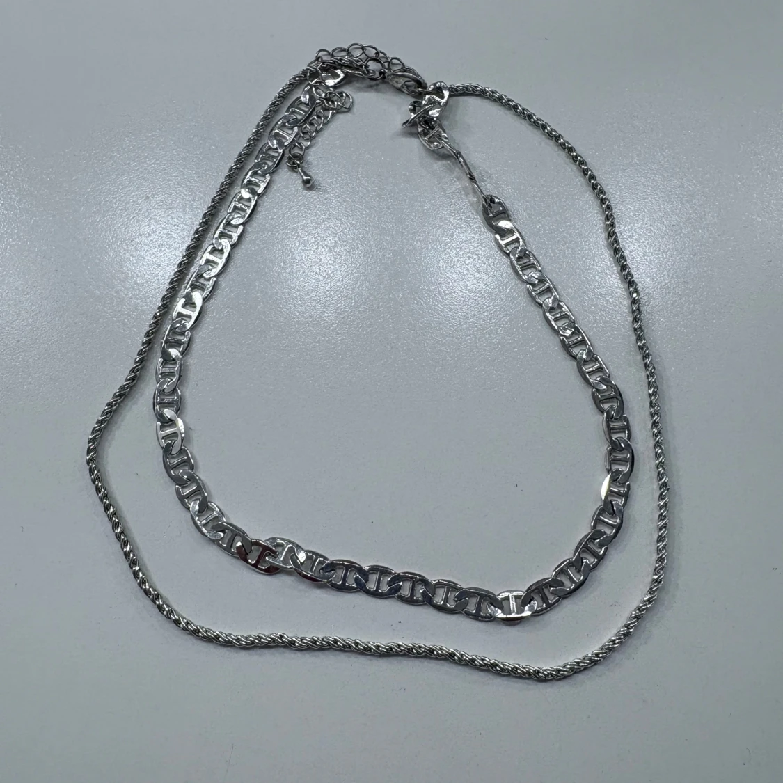 Säljer två snygga halsband i silverfärg. Det ena har en bredare, platt länkdesign medan det andra är tunnare med tvinnad kedja. Perfekta att bära tillsammans eller var för sig för en stilren look.