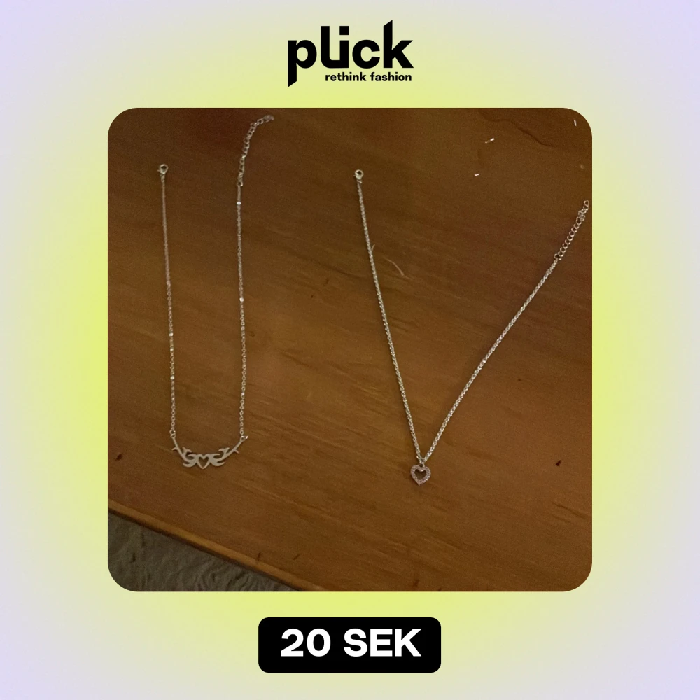 Säljer två superfina silverhalsband. Det ena har ett hängsmycke i form av ett hjärta med små glittriga stenar, perfekt för en romantisk look. Det andra halsbandet har en cool design med ordet 'love' i ett stiliserat typsnitt. Båda är i mycket bra skick och passar perfekt till fest eller vardag.