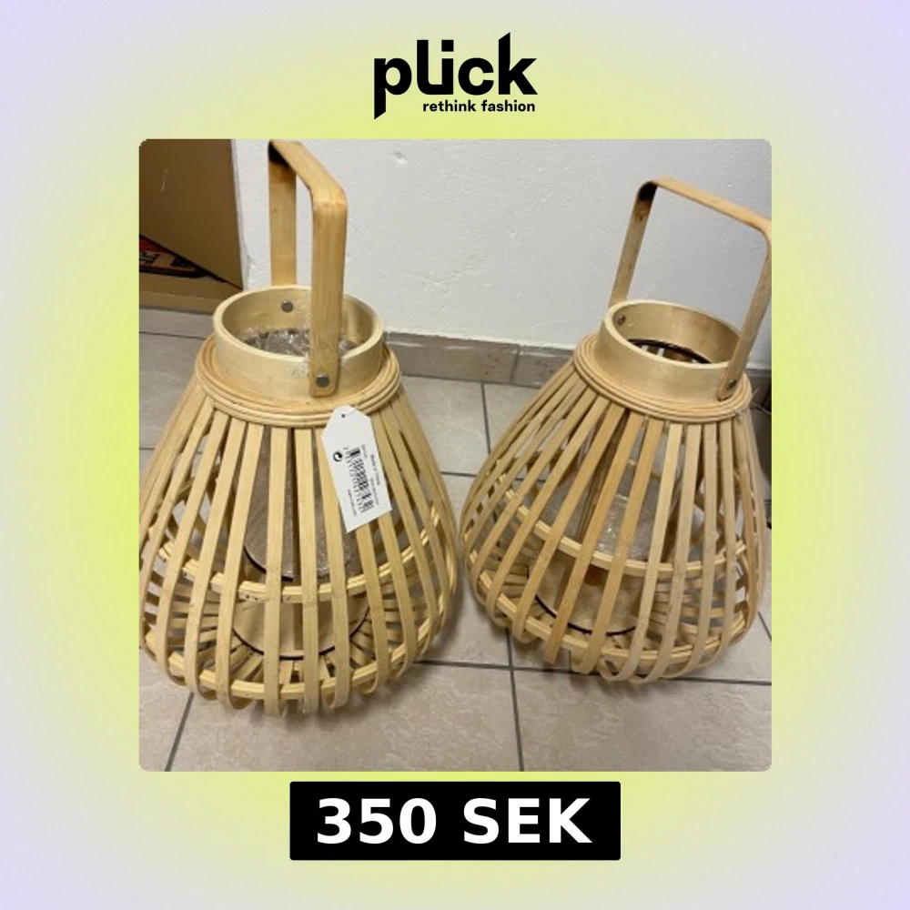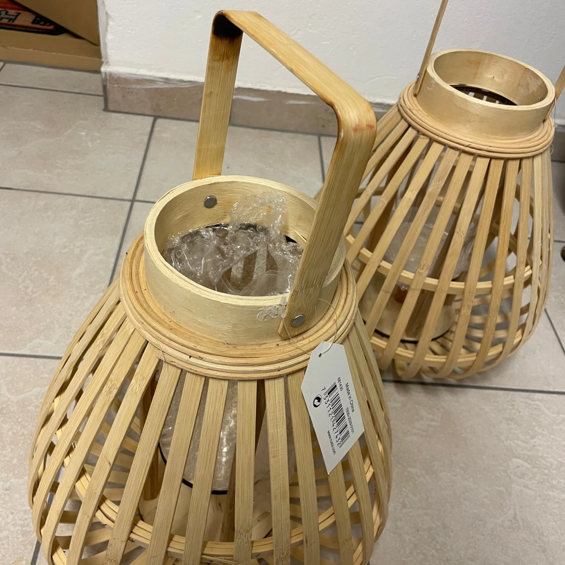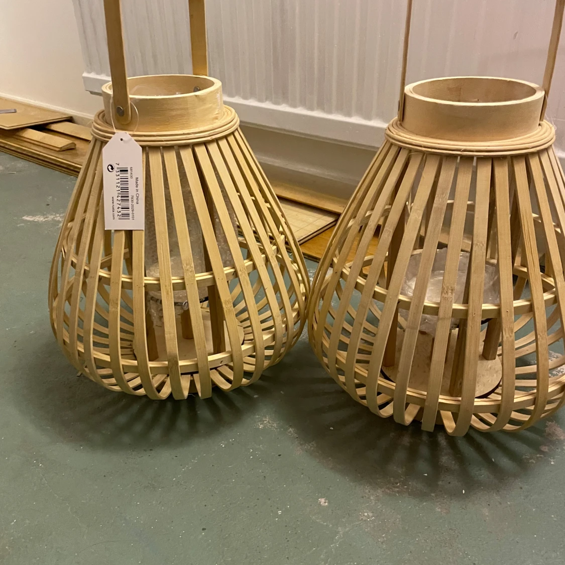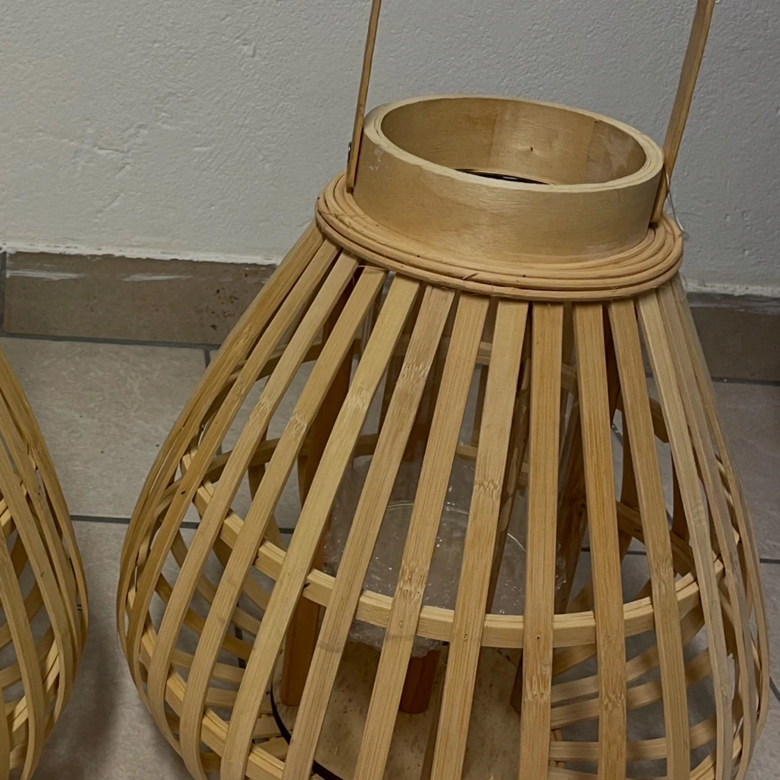 Säljer två stora bambulyktor med glasinsats. Perfekta för att skapa en mysig stämning både inomhus och utomhus. De har en naturlig träfärg och ett praktiskt handtag för enkel förflyttning. Passar utmärkt för blockljus eller LED-ljus.