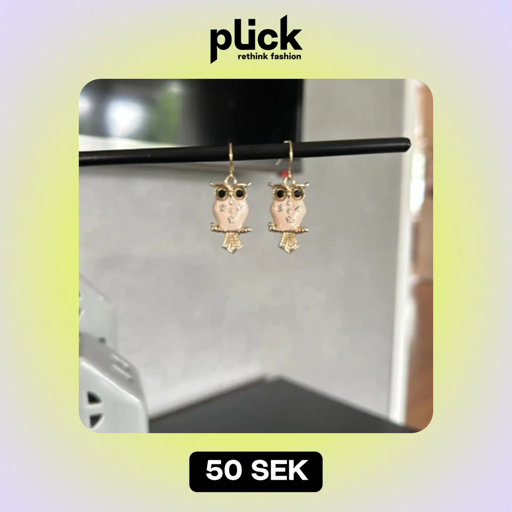 Uggla örhängen med justerbar krok. Gummiplupp medföljer. Guldig med rosa detaljer. Smyckesbox medföljer. Använd ca 2 gånger.