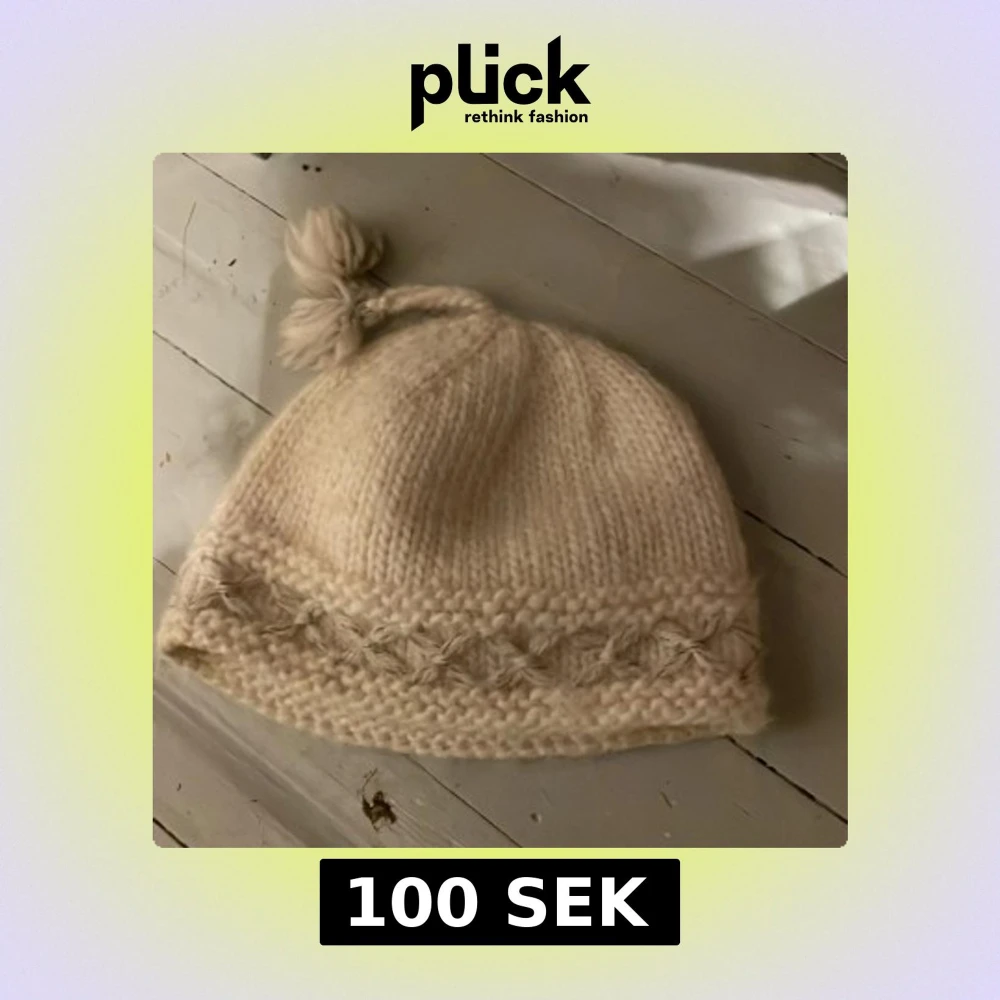 Mysig beige stickad mössa med en dekorativ tofs på toppen. Den har ett fint mönster längs kanten som ger extra stil. Perfekt för kyliga dagar! Ull