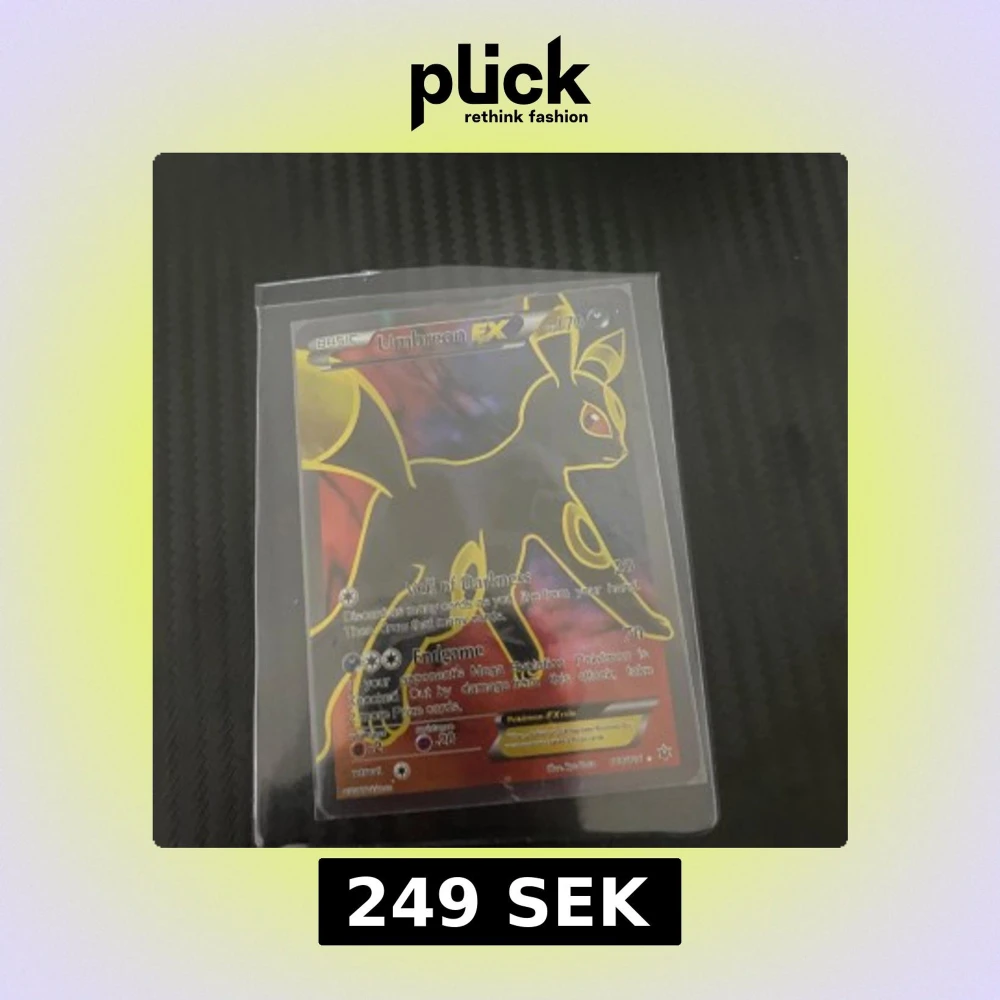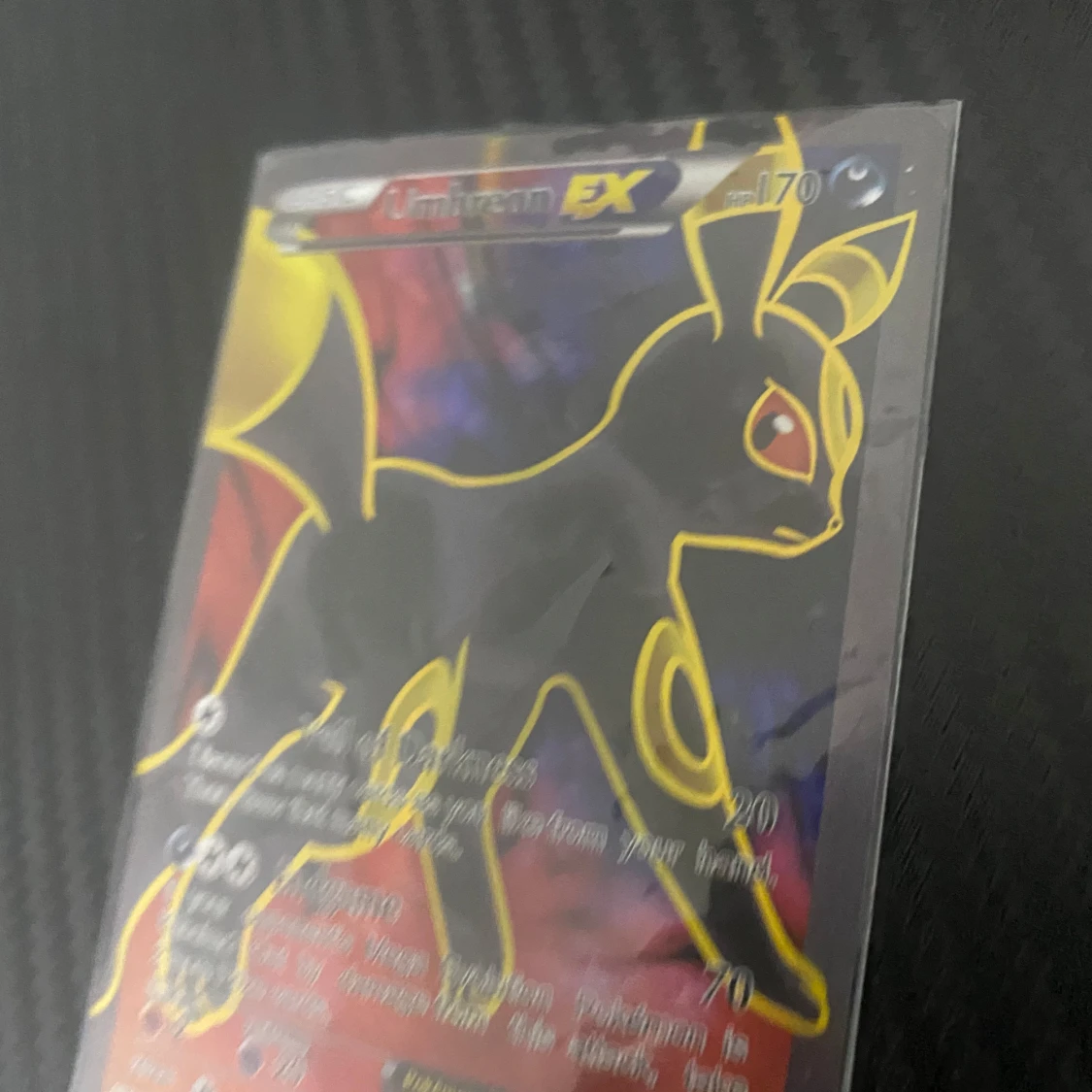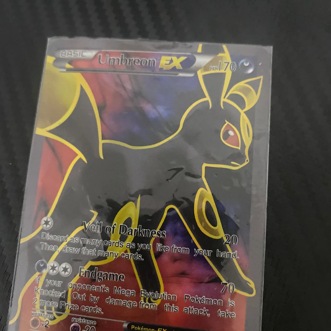 Säljer ett Umbreon EX Pokémonkort med en holografisk design. Kortet har en mörk och mystisk illustration av Umbreon med texten 'Veil of Darkness' och 'Endgame'. Perfekt för samlare eller Pokémon-entusiaster!
