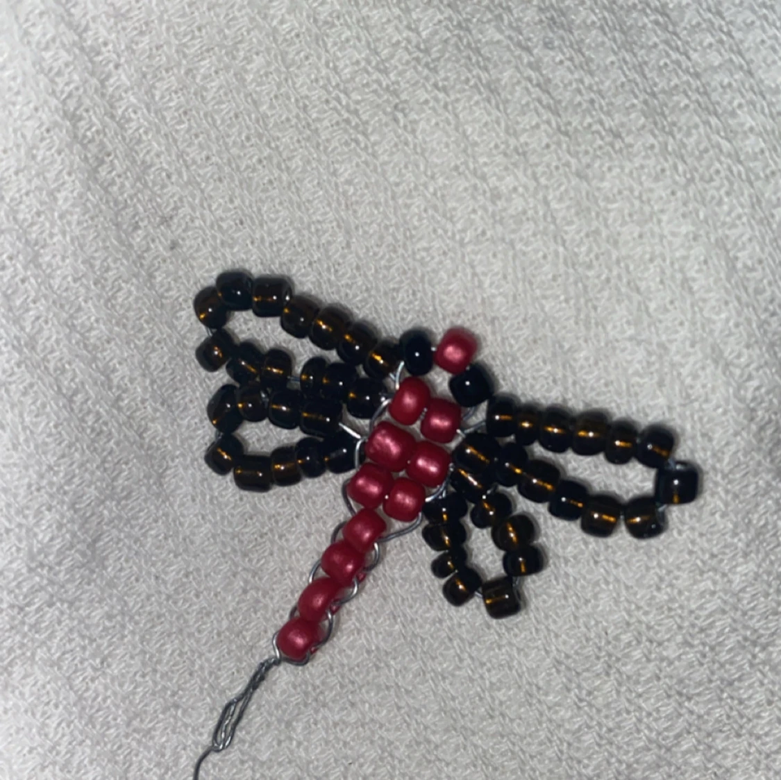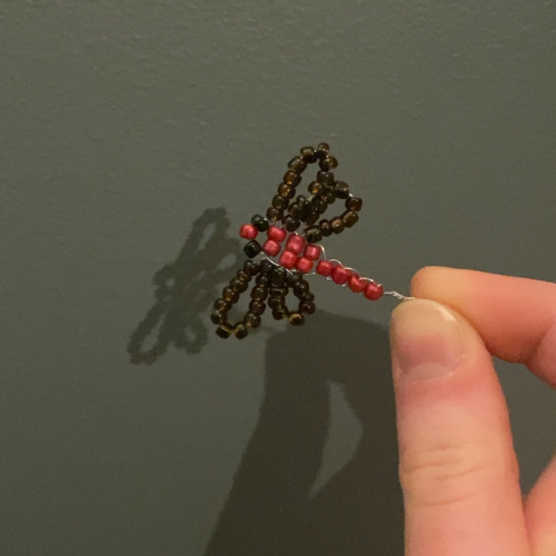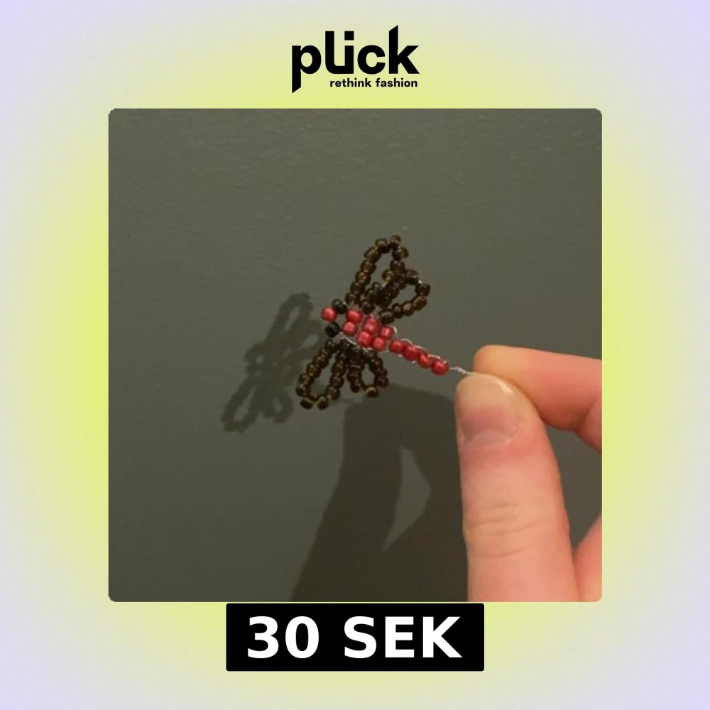 Unik handgjord pärlfigur föreställande en trollslända. Den är skapad med svarta och röda pärlor, vilket ger en fin kontrast. Perfekt som en dekorativ accessoar eller som en personlig present. Bara skriv om det finns frågor! Kan göra fler i nästan alla färger och storlekar