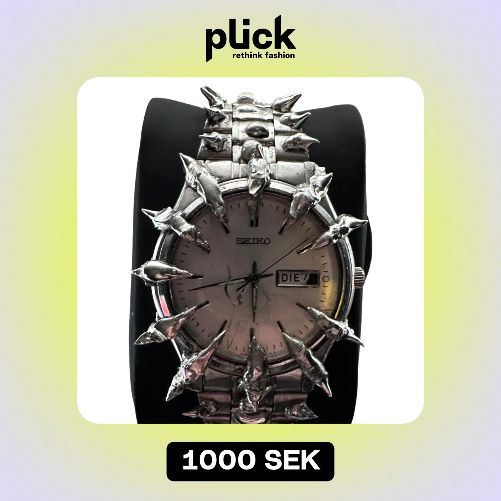 Säljer en riktigt cool och unik Seiko-klocka i silver med spikdetaljer runt boetten och armbandet. Klockan har en klassisk urtavla med datumvisning. Perfekt för dig som vill sticka ut och ha en edgy stil. Passar både till vardags och fest!