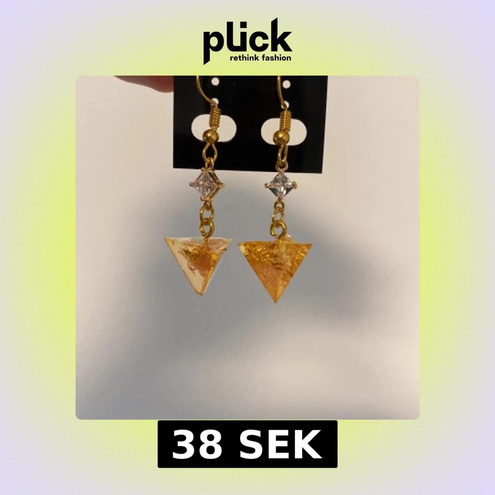 Unika örhängen med guldiga detaljer och hängande transparenta trianglar fyllda med guldglitter. Ovanför trianglarna sitter en liten fyrkantig kristall som ger extra bling. Perfekt för dig som gillar statement-smycken och geometriska former.