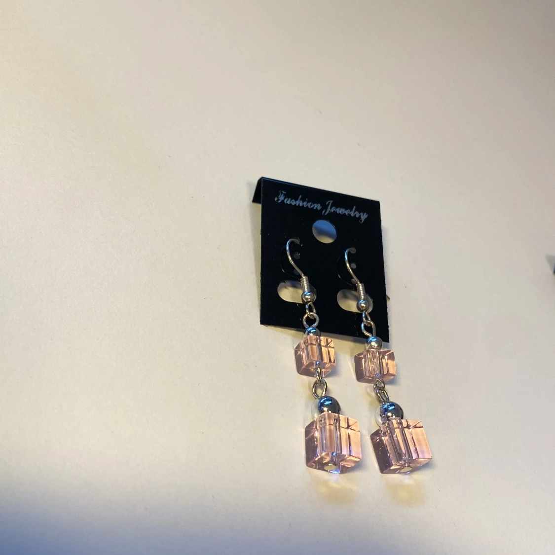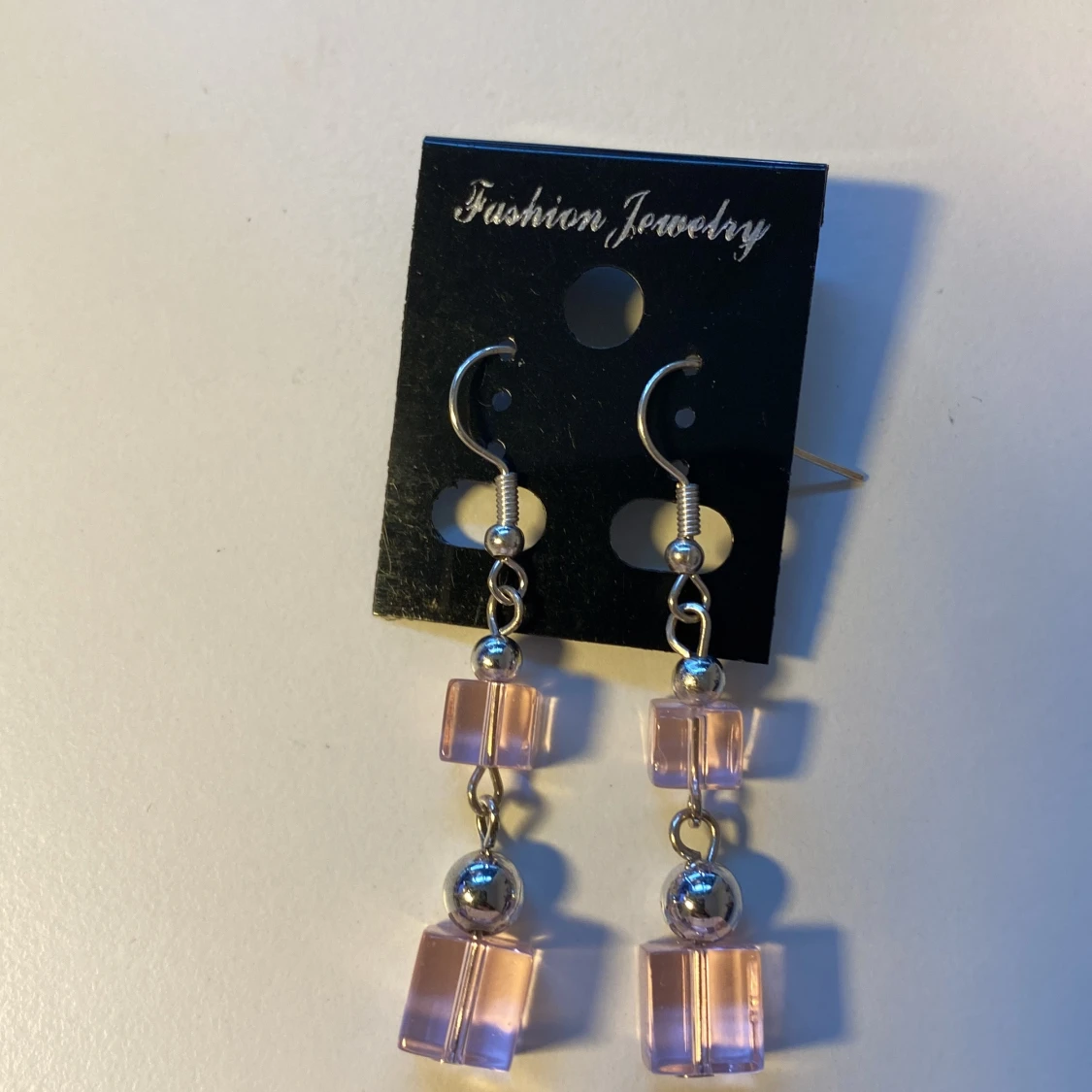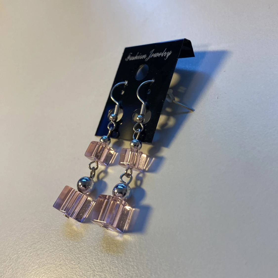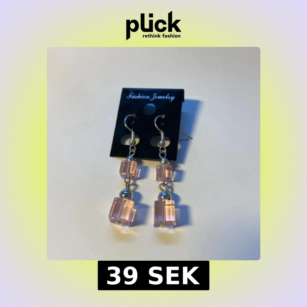 Snygga hängande örhängen med två rosa, kubformade pärlor i akryl på varje örhänge. Mellan kuberna sitter en liten silverfärgad kula och krokarna är i metall. Perfekt accessoar för att ge din look en söt och modern touch.