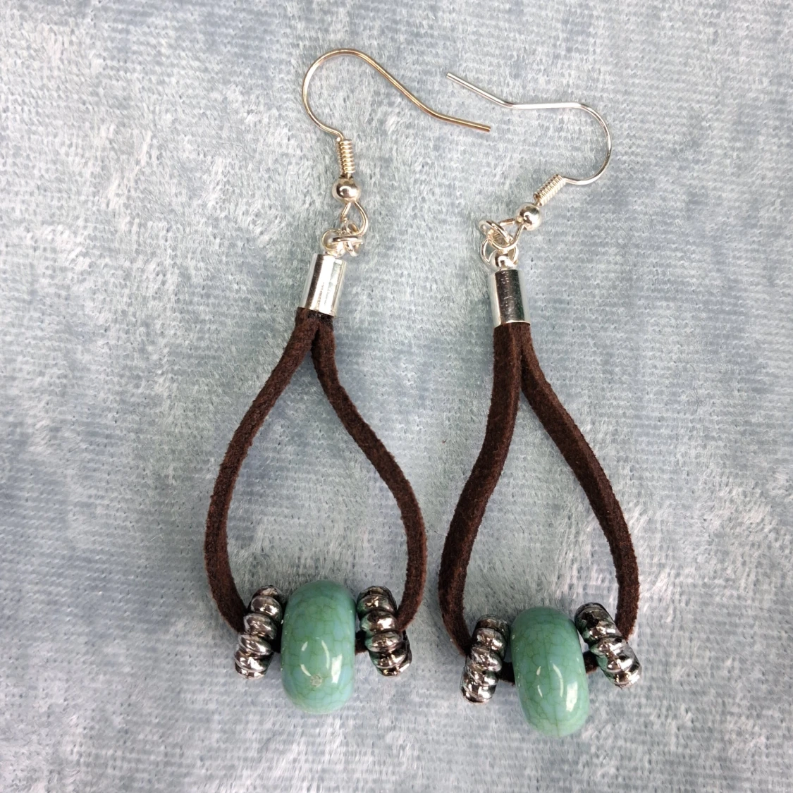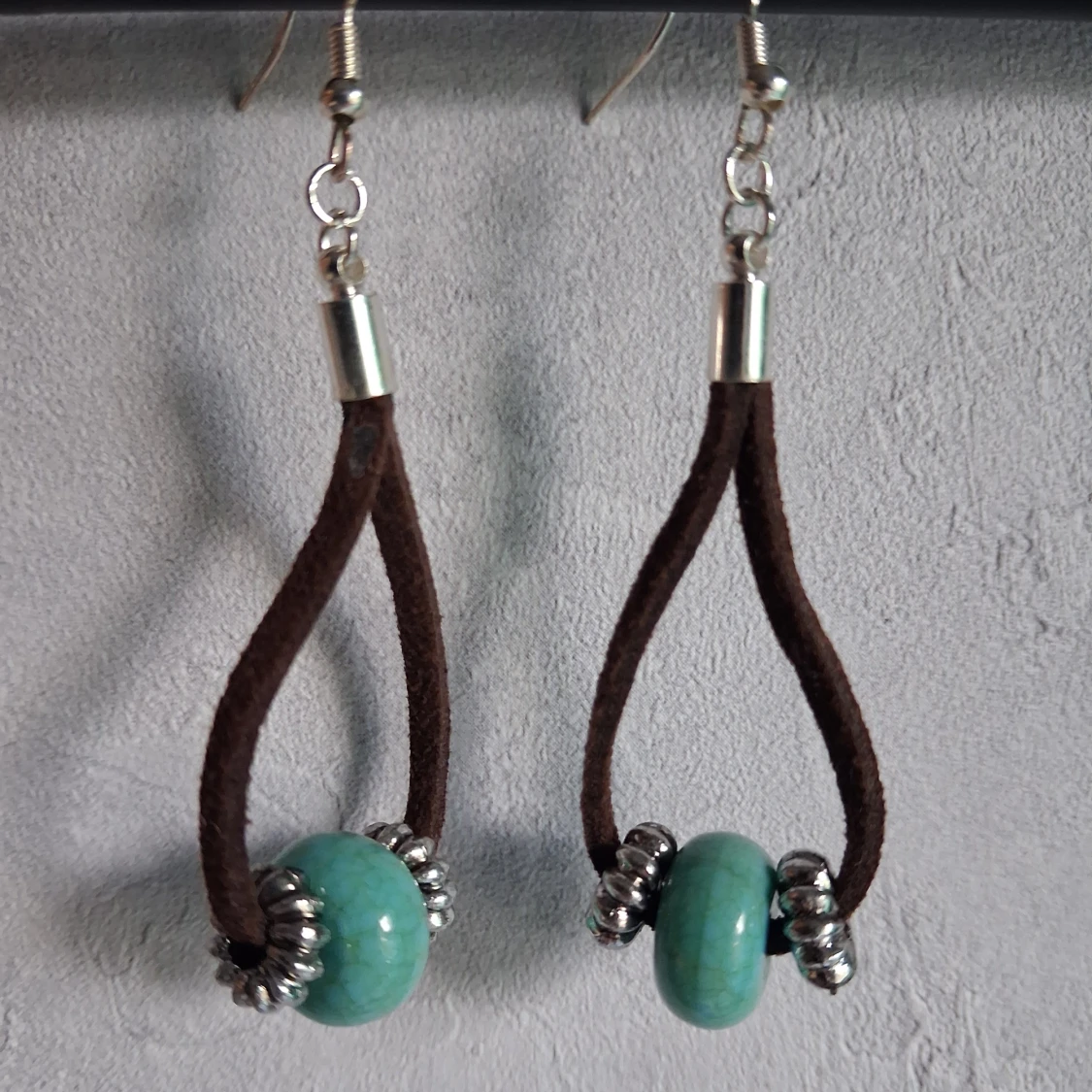 Unika örhängen med brunt läderimiterat mockaband formade, dekorerade med stora turkosa pärlor och silver/gråa pärlor. Perfekt accessoar för dig som gillar boho-stil och vill sticka ut med något annorlunda. Öronkroken är nickelsäker och aldrig använda