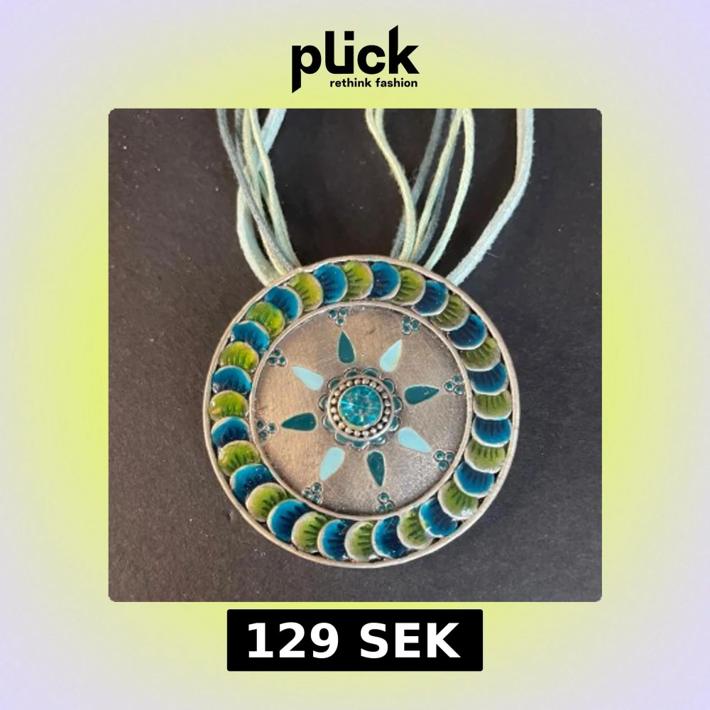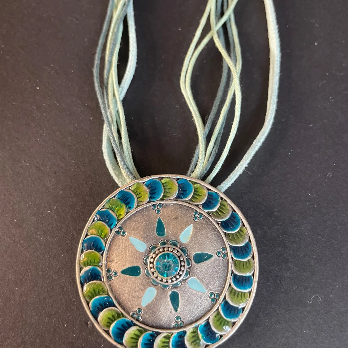 Unikt halsband med ett stort, cirkulärt hängsmycke i silverfärg. Smycket har ett vackert mönster med blå och gröna detaljer samt en central turkos sten. Hängsmycket är fäst vid flera tunna band i matchande färger.