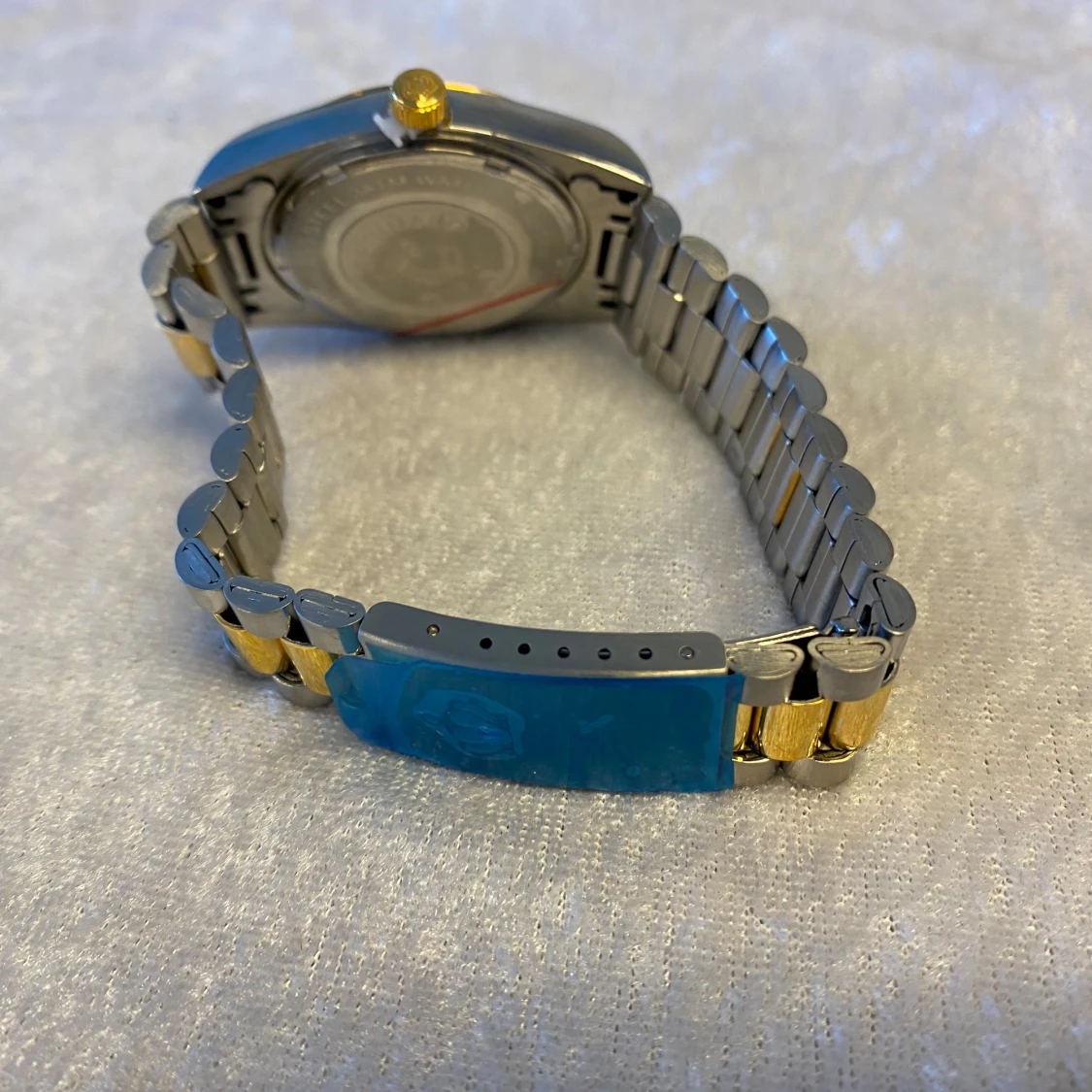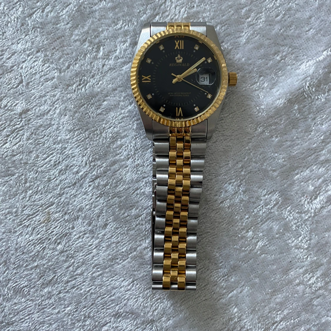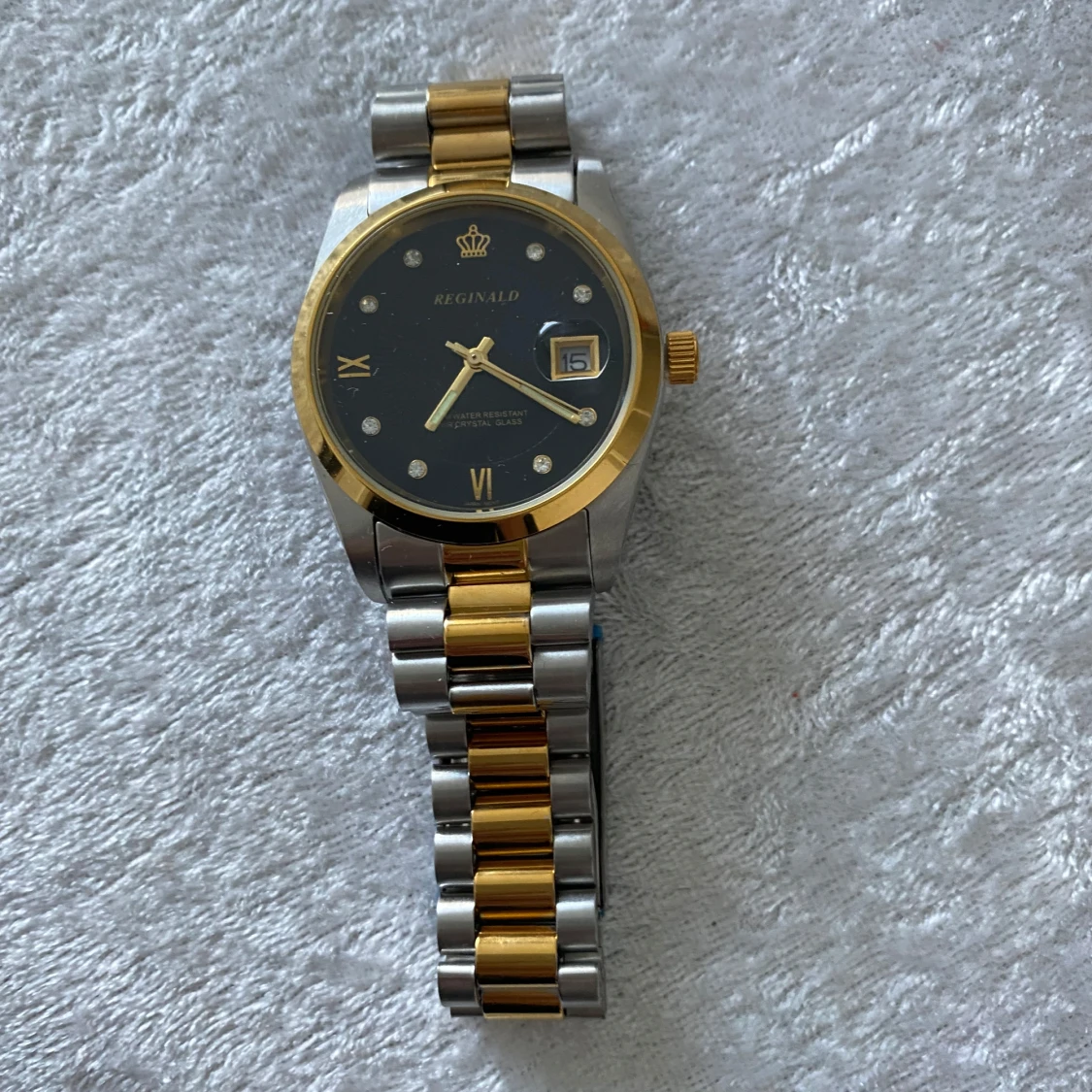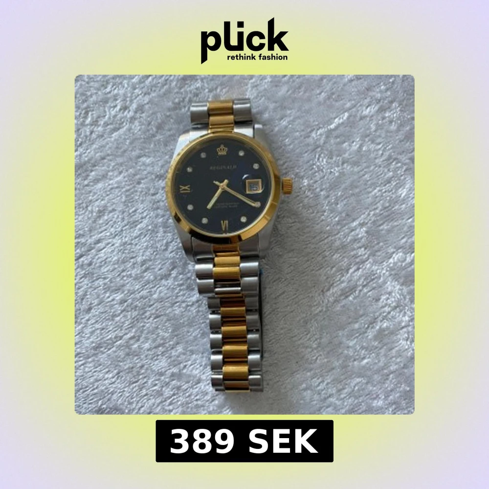 Snygg Reginald klocka med svart urtavla, gulddetaljer och datumvisning. Armbandet är i tvåtonad metall med både guld- och silverfärgade länkar. Klockan har romerska siffror och glittriga indexmarkeringar, samt en klassisk rund boett och guldfärgad krona. Nya klockan med nya batteri, 389kr/st