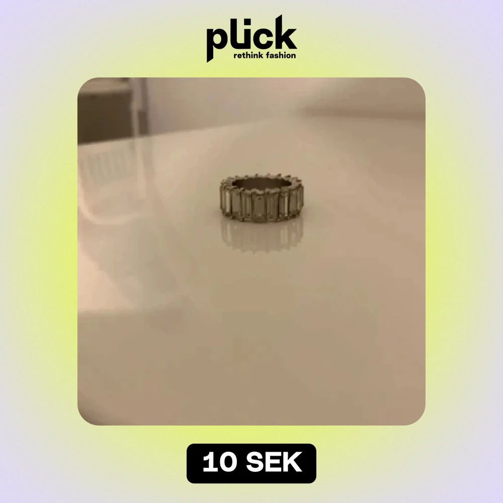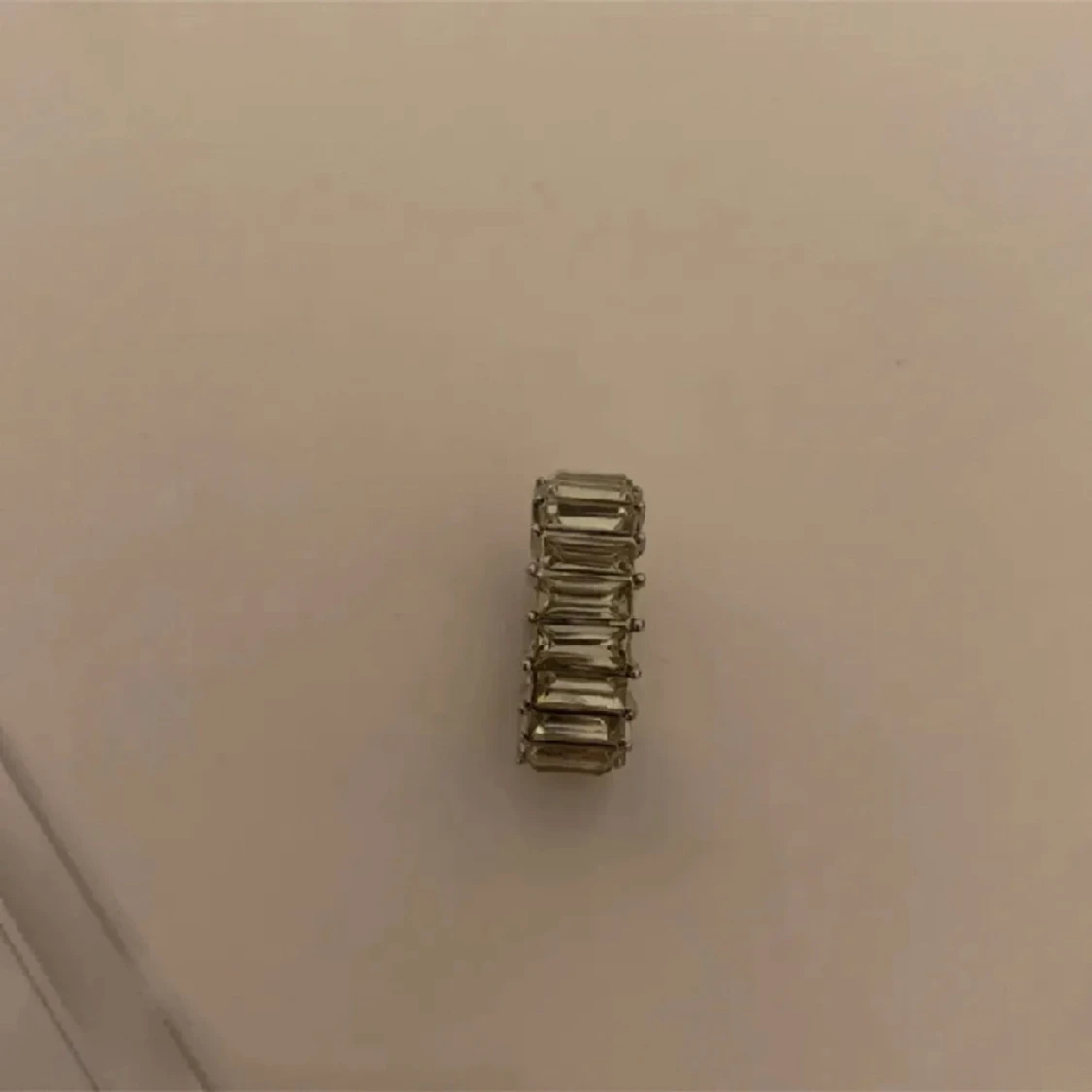 En elegant silverring dekorerad med rektangulära stenar runt hela ringen. Ringen har en glittrig och lyxig design som passar perfekt för festliga tillfällen.
