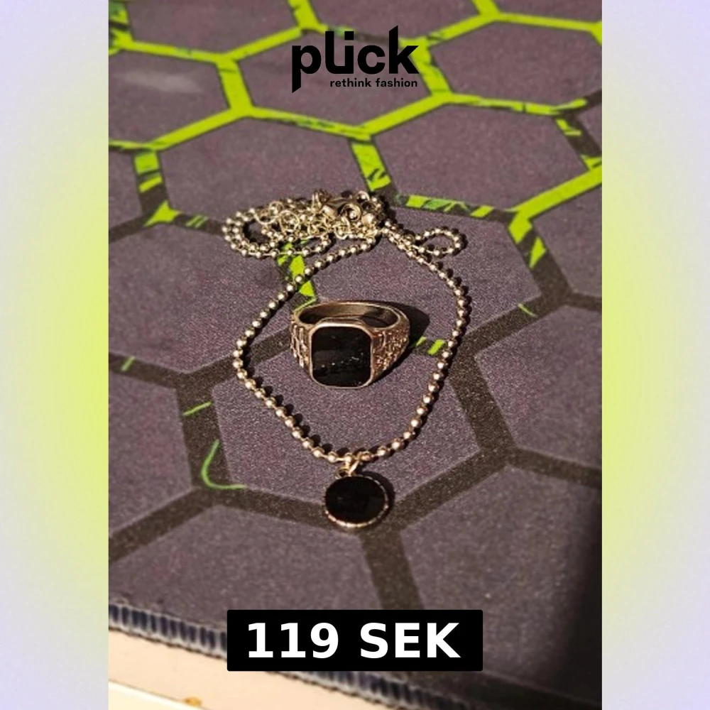 Säljer ett set med en chunky silverfärgad ring med fyrkantig svart sten och ett matchande halsband med rund svart hängsmycke på kulkedja. Båda har en cool och stilren vibe, perfekta för att lyfta din outfit med lite edge.