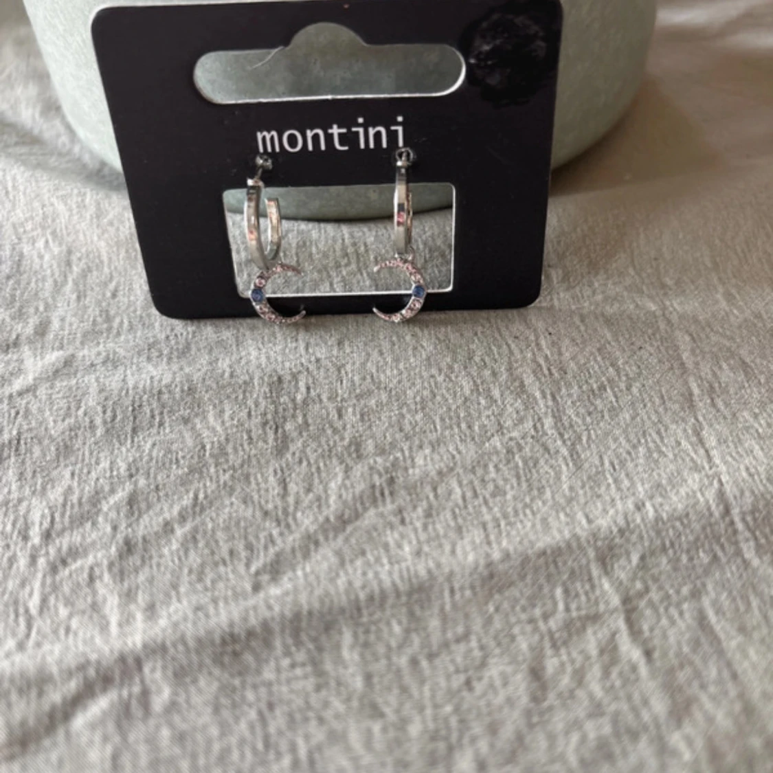 Snygga silvriga örhängen från Montini med små halvmåneberlocker dekorerade med glittriga stenar. Perfekta för att ge din look en cool och trendig touch. Hängande modell som passar till många stilar.