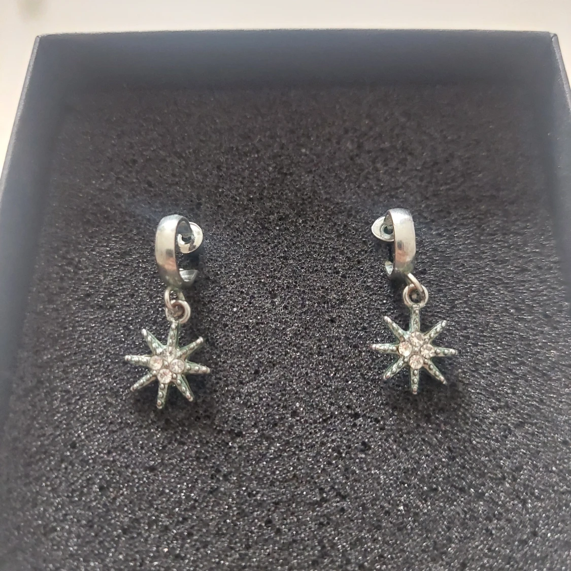 Snygga silvriga örhängen med hängande stjärndetaljer. Stjärnorna är dekorerade med små stenar som fångar ljuset fint.⭐️